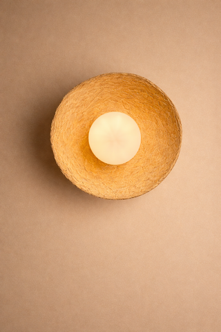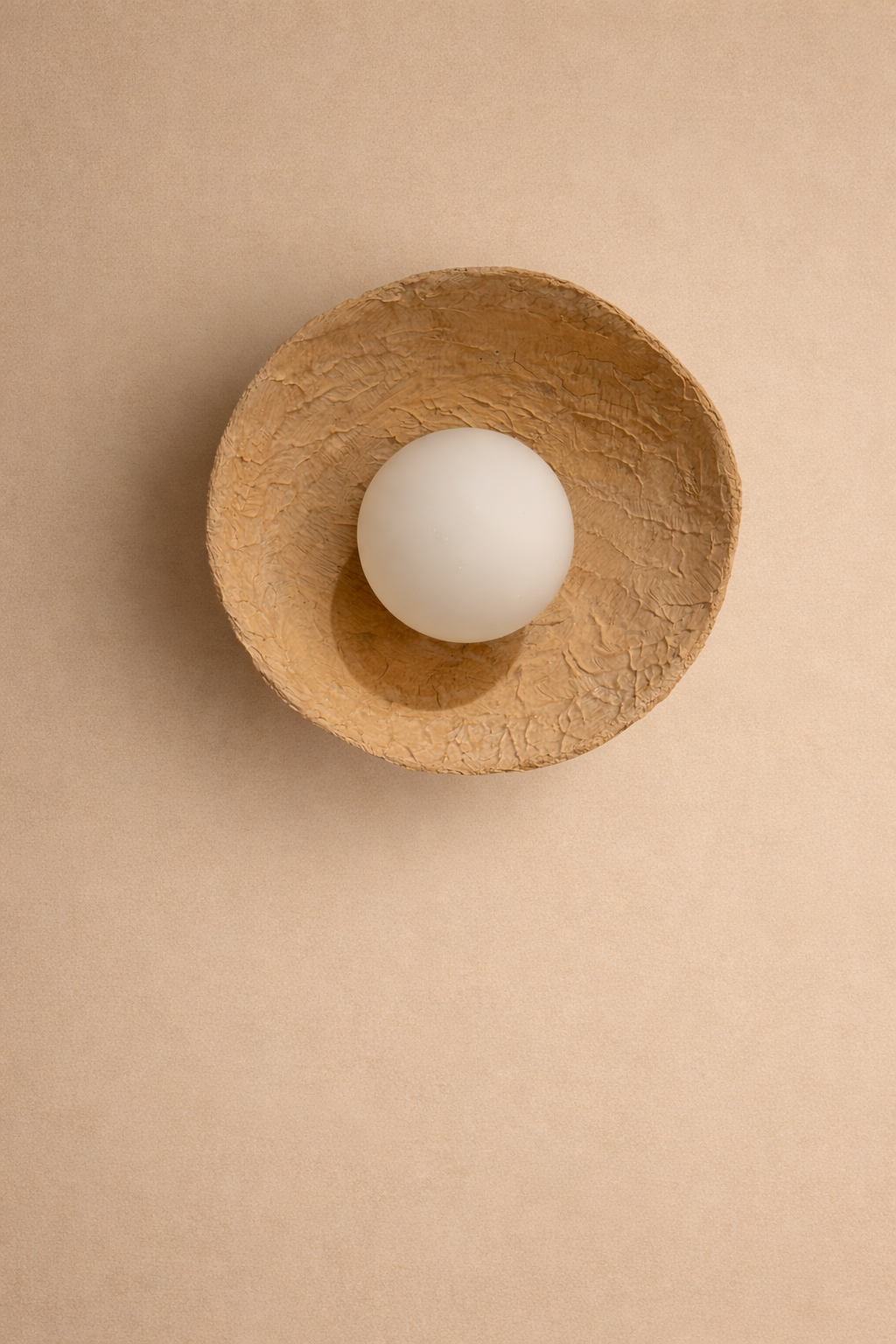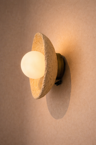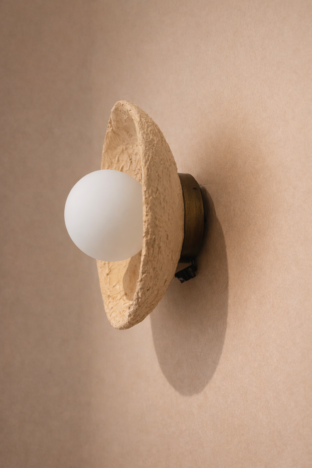 Aplique decorativo de inspiración artesanal que aporta una luz suave y envolvente. Su pantalla texturizada de acabado cálido y la esfera central de vidrio opal crean una iluminación perfecta. La base sobre la que apoya el aplique es de latón envejecido.