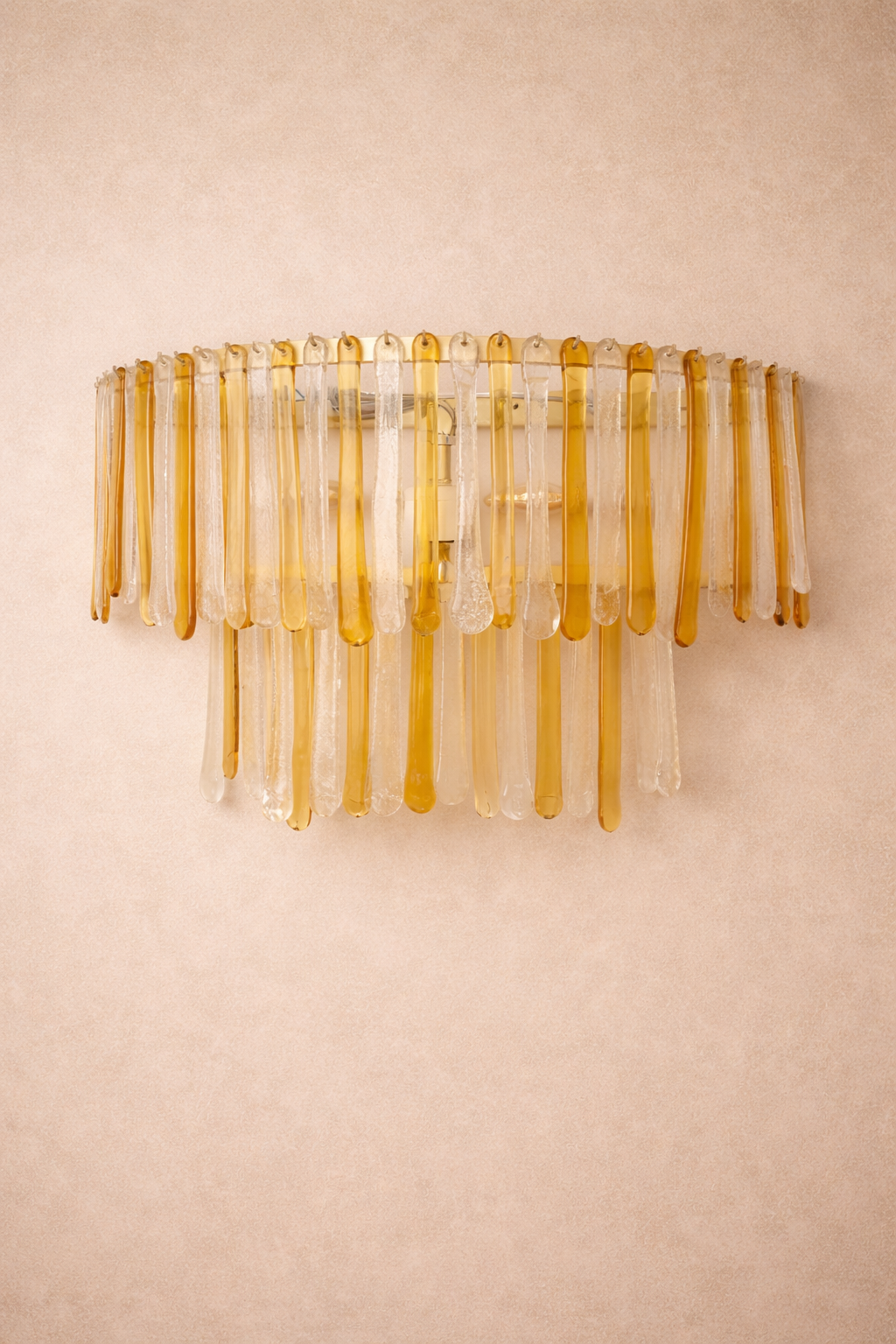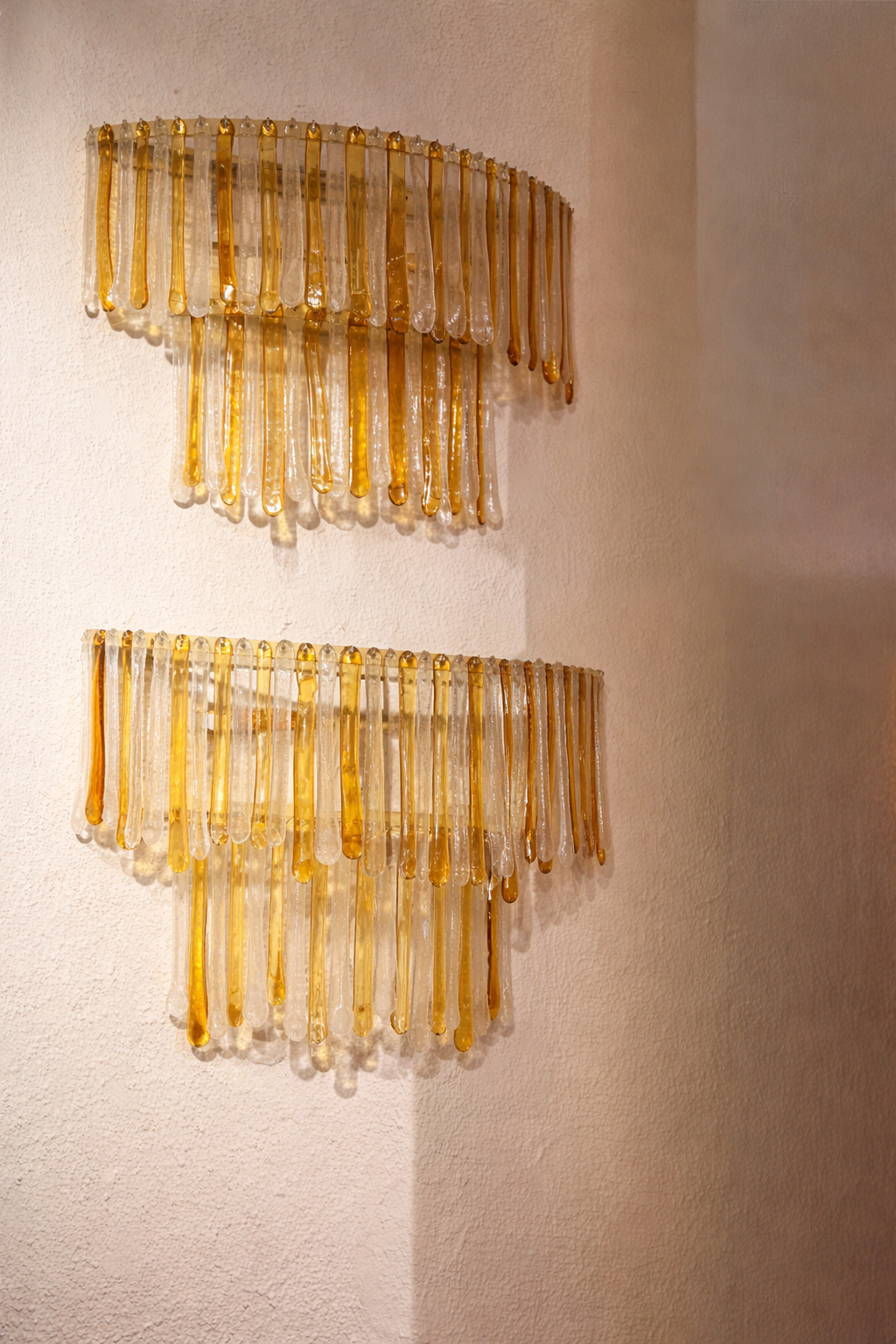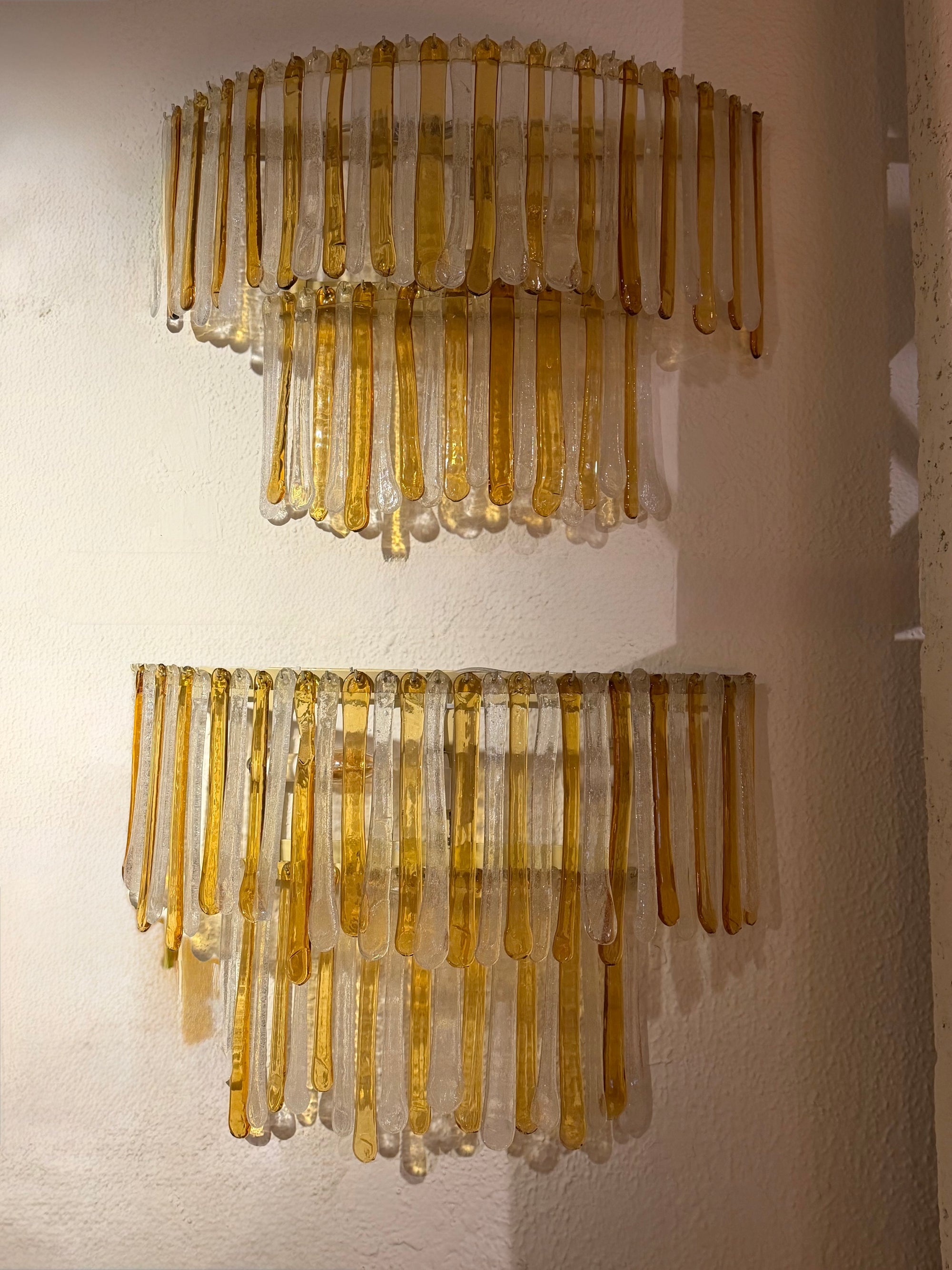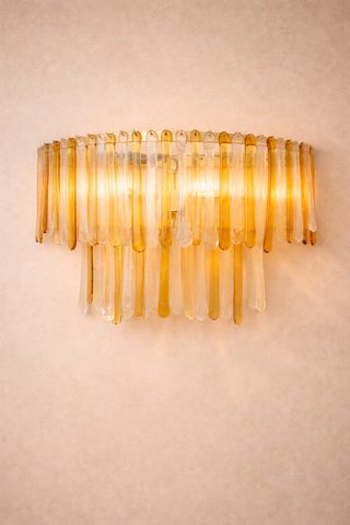 Elegante aplique vintage realizado en vidrio de Murano soplado, compuesto por piezas verticales en tonos ámbar y transparente. Su diseño en cascada crea una iluminación cálida y envolvente, con reflejos dorados muy decorativos. Una pieza icónica del diseño italiano de los años 70, ideal como punto focal en interiores sofisticados. Disponible pareja.