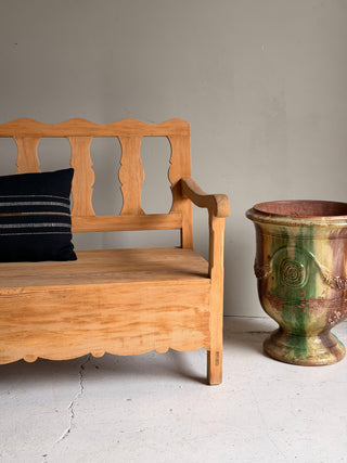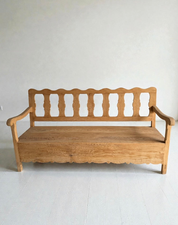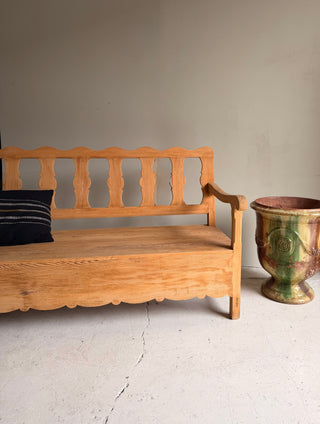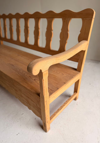 Banco artesanal fabricado en madera de pino macizo, con respaldo y reposabrazos. Diseño sólido y funcional, con acabado natural que resalta la madera. Ideal para recibidores, comedores o zonas de paso.
