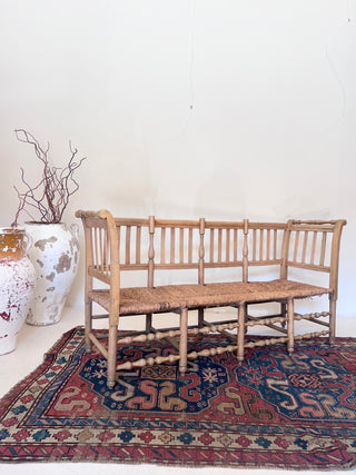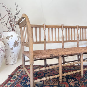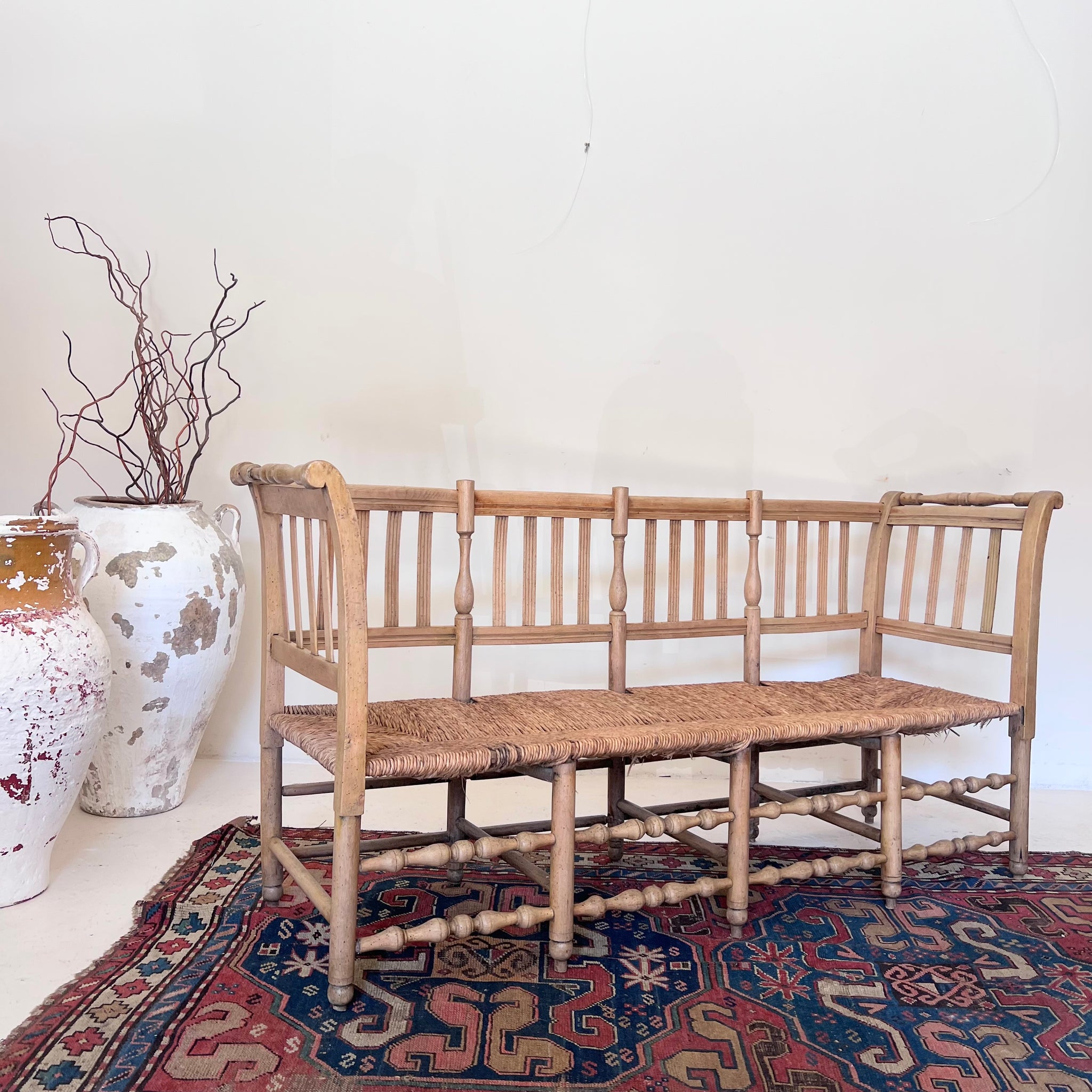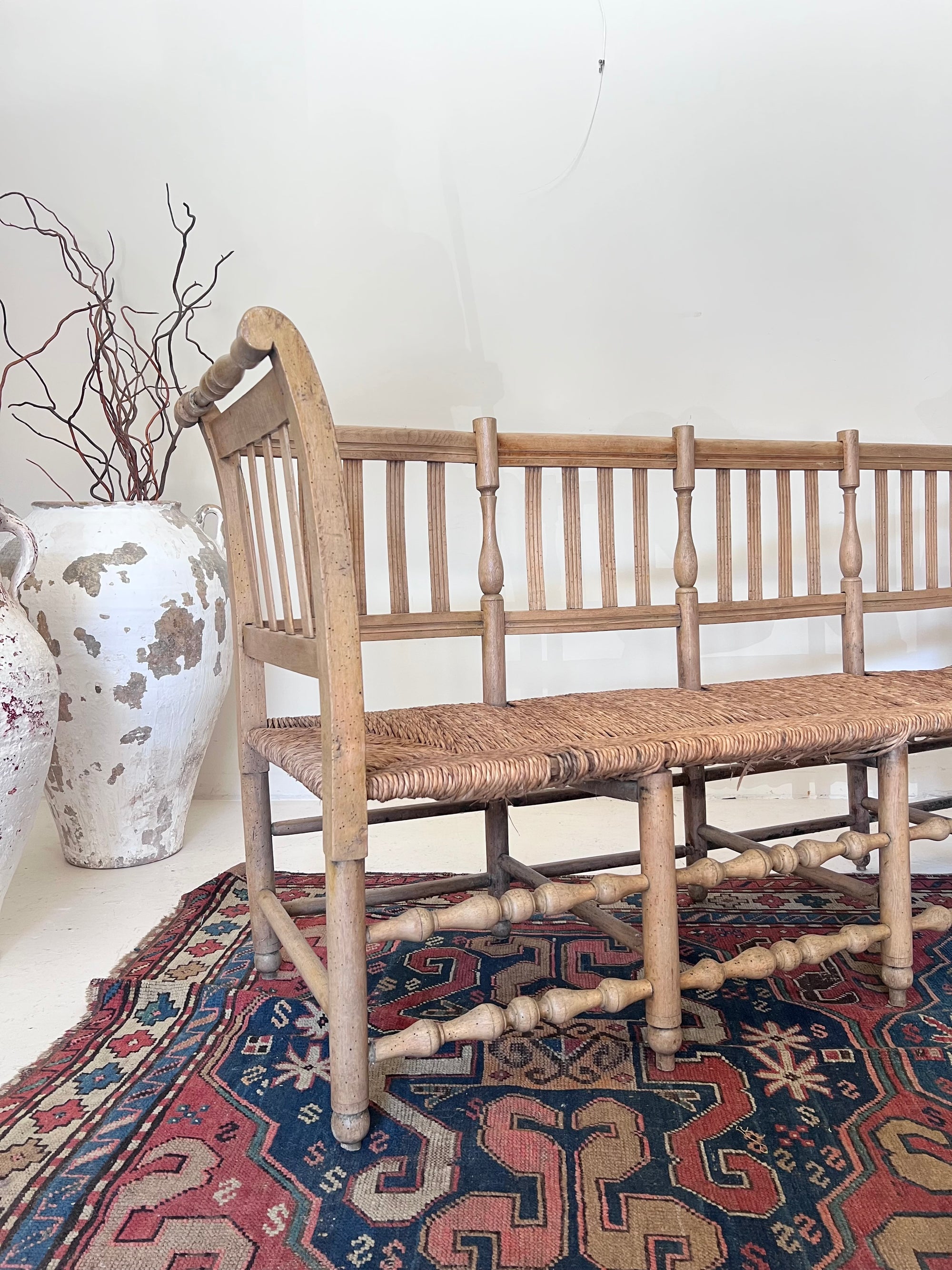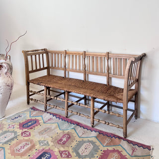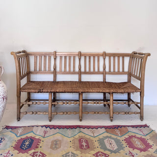 Banco de origen francés realizado en madera maciza de roble con respaldo de barrotes torneados y brazos curvos. El asiento es de rejilla trenzada de paja tradicional, característica de la ebanistería rural francesa. La estructura descansa sobre patas rectas unidas por travesaños torneados que refuerzan y decoran la pieza. Finales del siglo XIX.