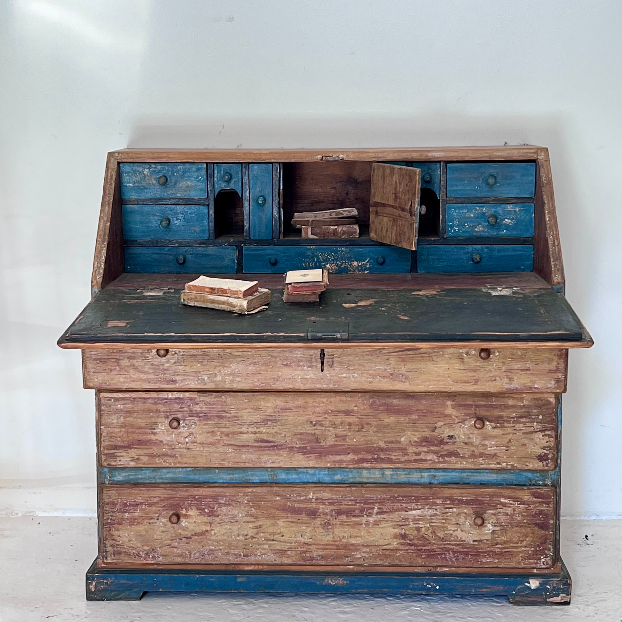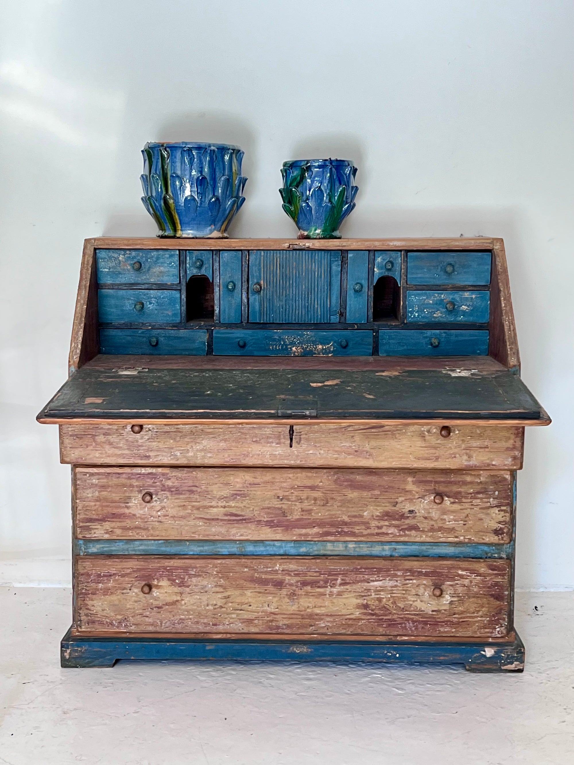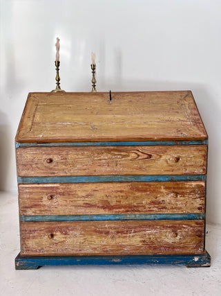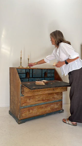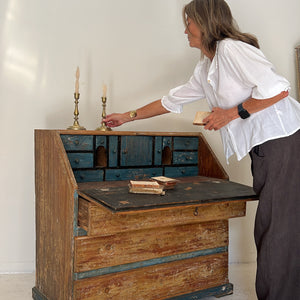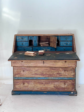 Bureau sueco con pátina azul original – Siglo XIX. Es un mueble único realizado en madera maciza con hermosa pátina original en tonos azul añil y madera natural desgastada.