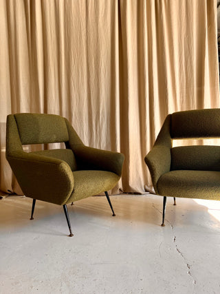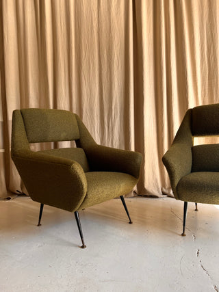 Butaca Mid century, diseñada por Gigi Radice para Minotti en los años 50. Icono del diseño italiano: elegante, cómoda y completamente restaurada, conservando su esencia original. Con elegantes lineas, patas de latón y silueta envolvente. Tapicería  en tela de algodón boucle, verde oliva. Disponible pareja