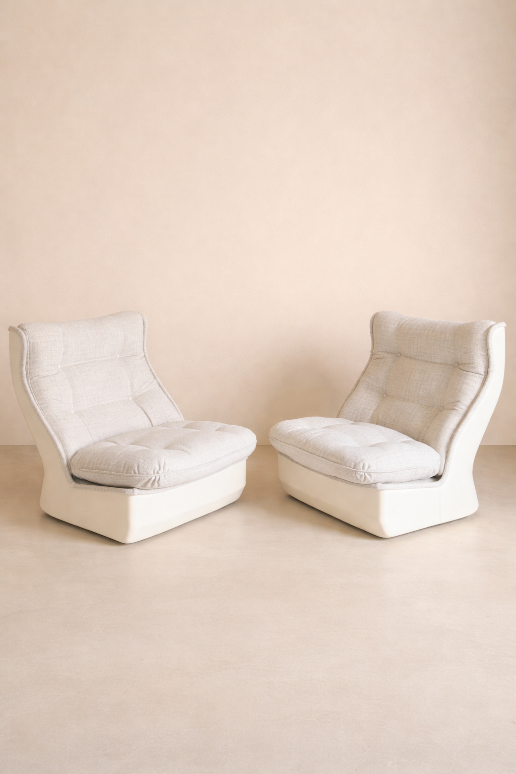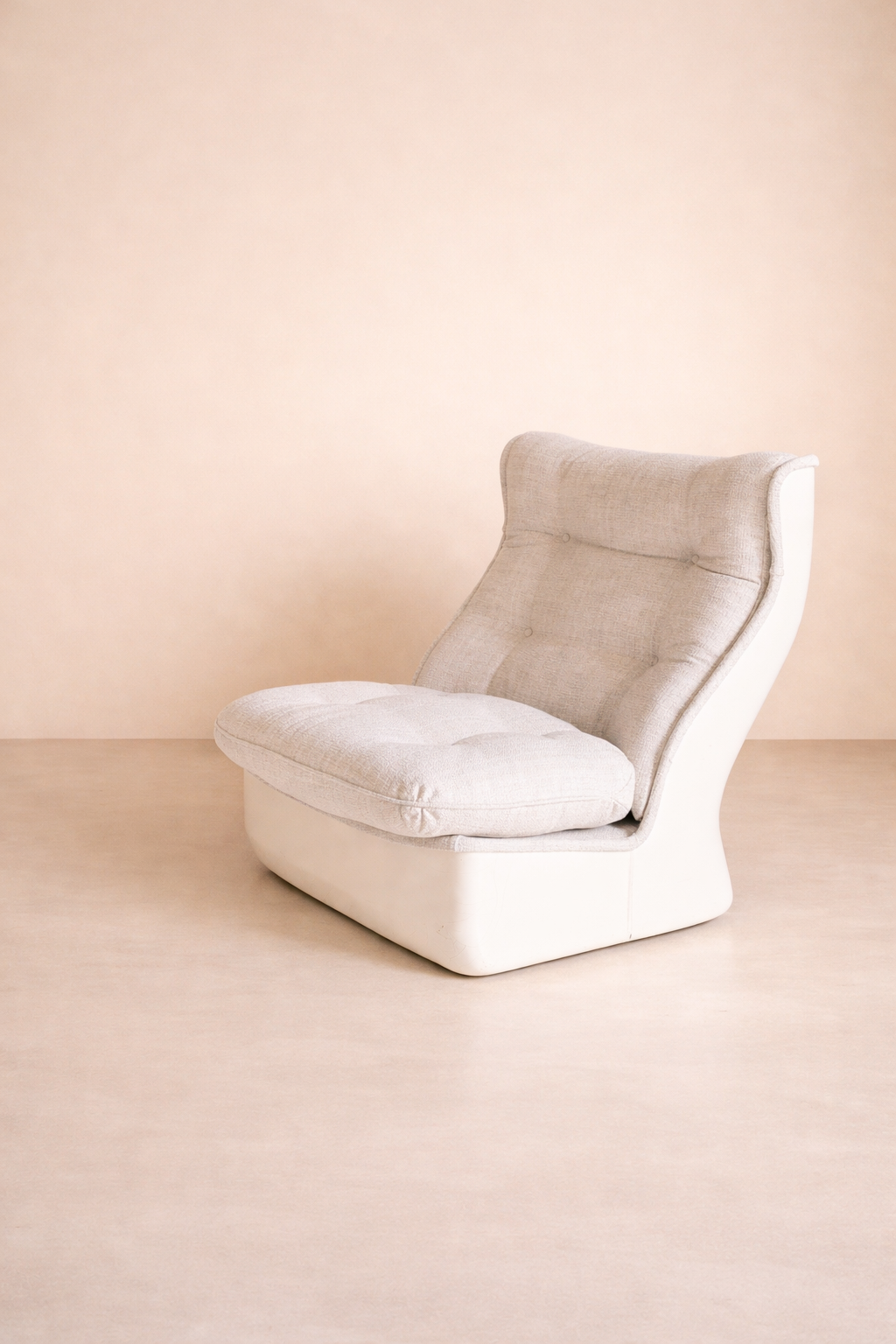 Icónica butaca de diseño Space Age creada por Michel Cadestin para Airborne en 1968. Presenta una base escultórica de fibra de vidrio blanca con líneas orgánicas inspiradas en los pétalos de una orquídea, combinada con cojines acolchados que aportan gran comodidad. Retapizado en una tela de algodón color beige.