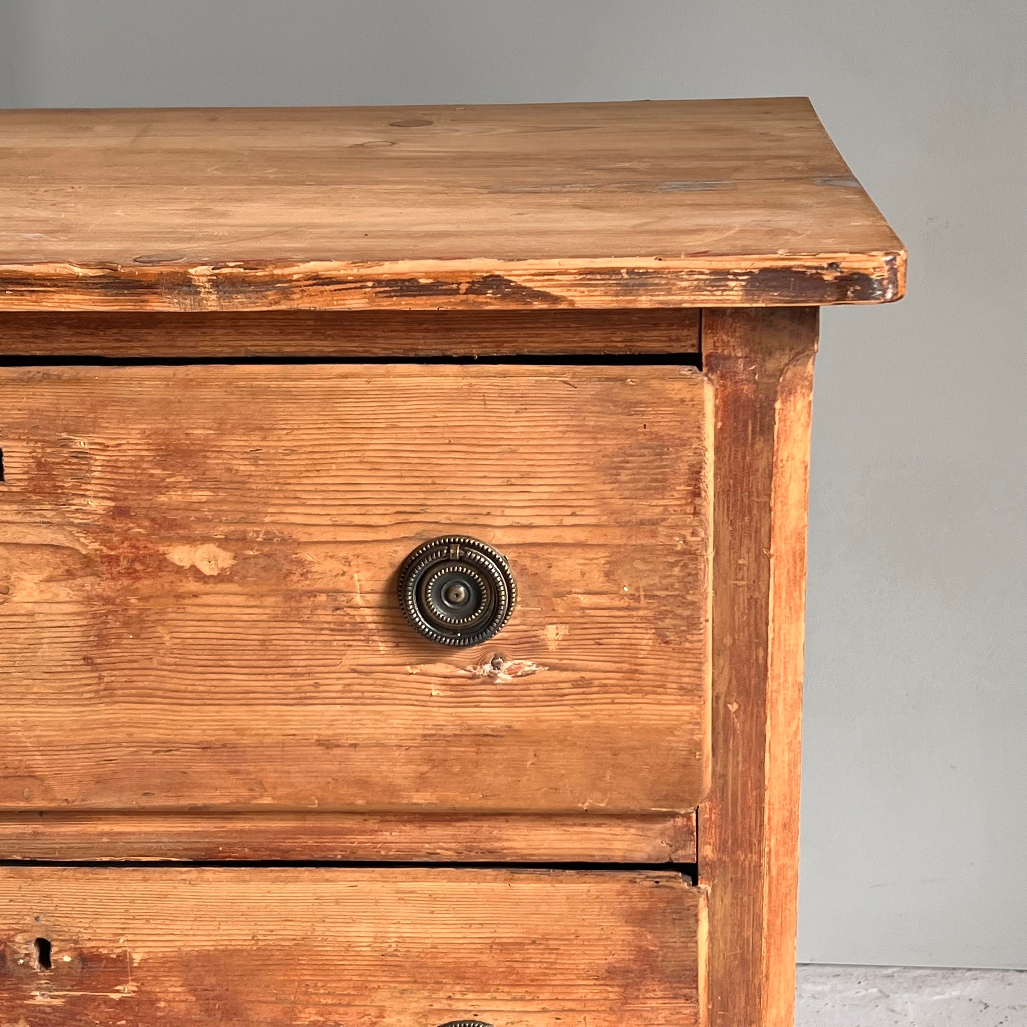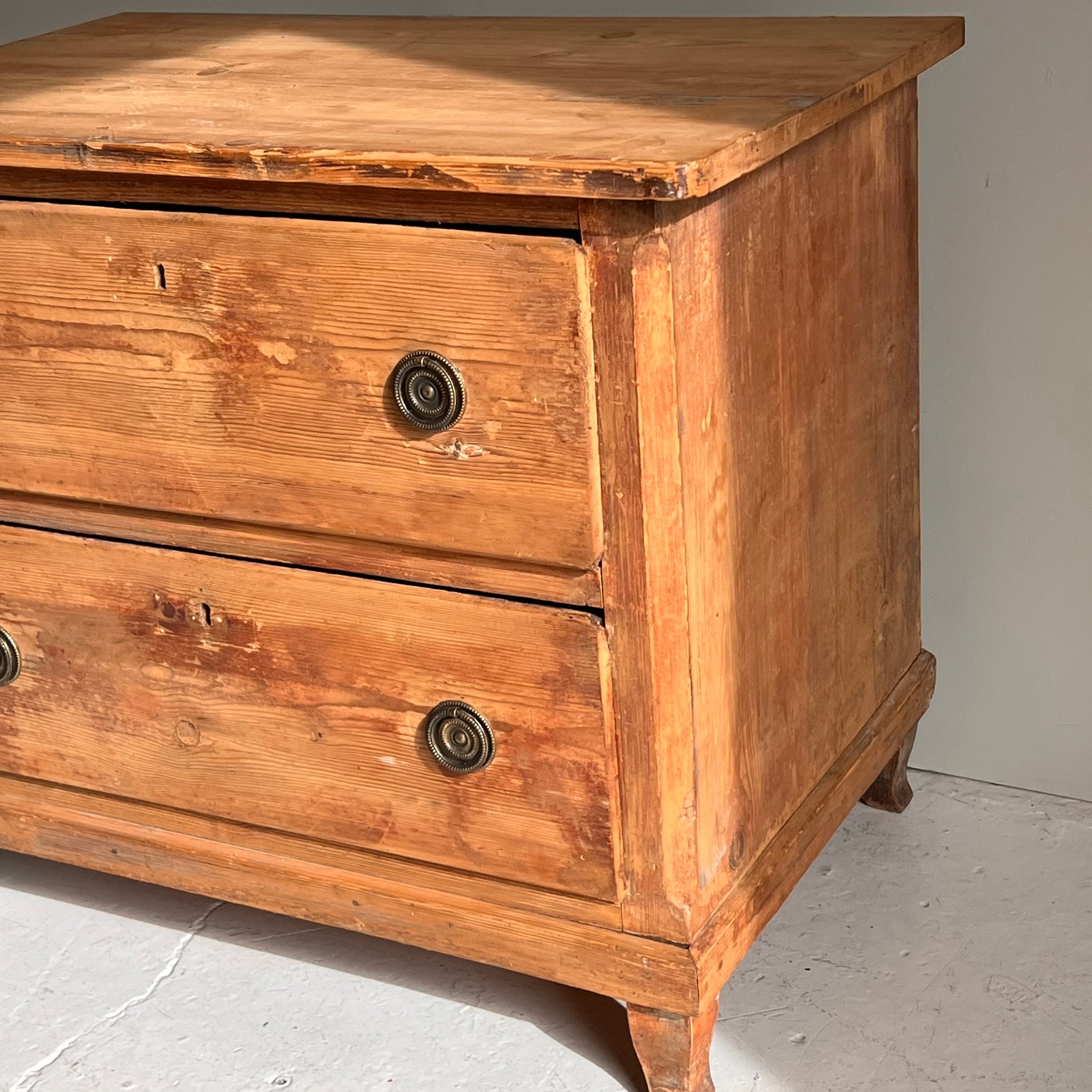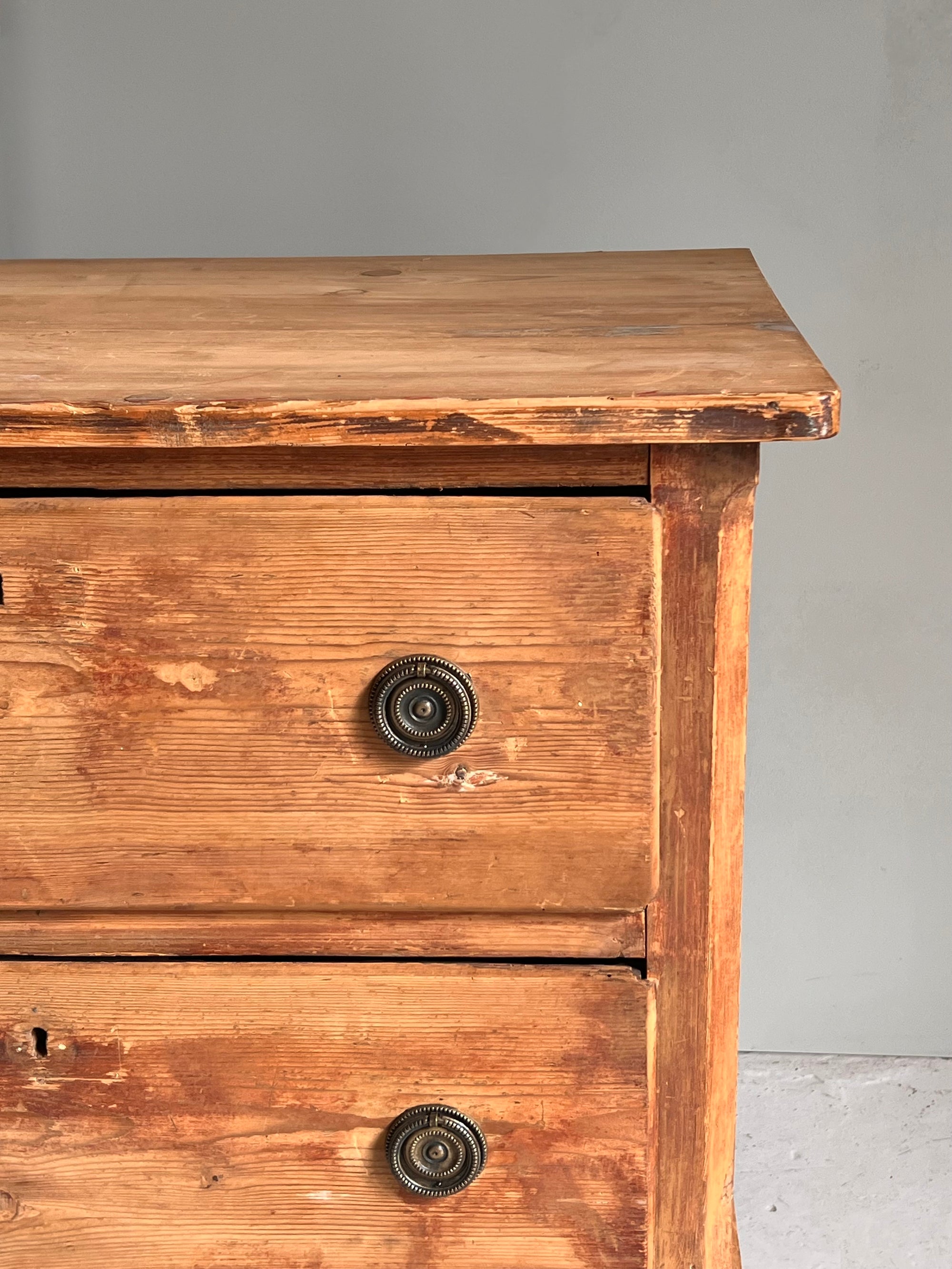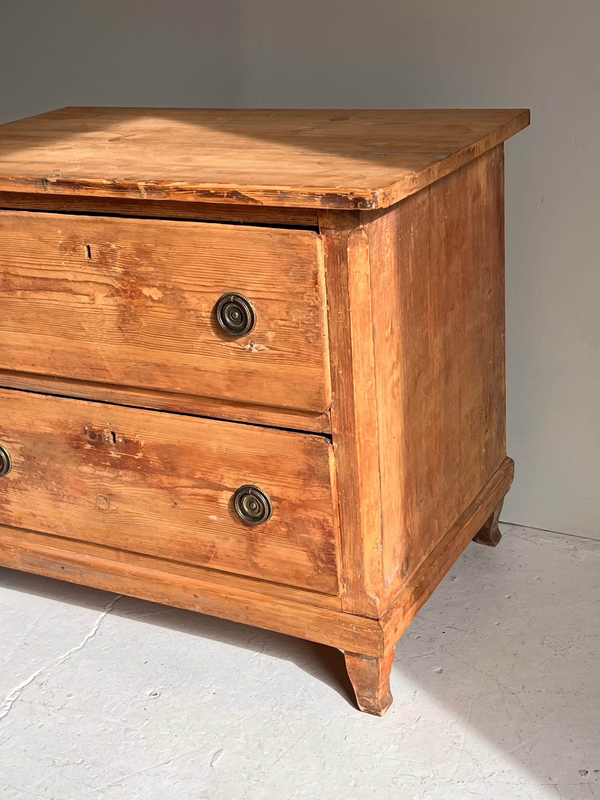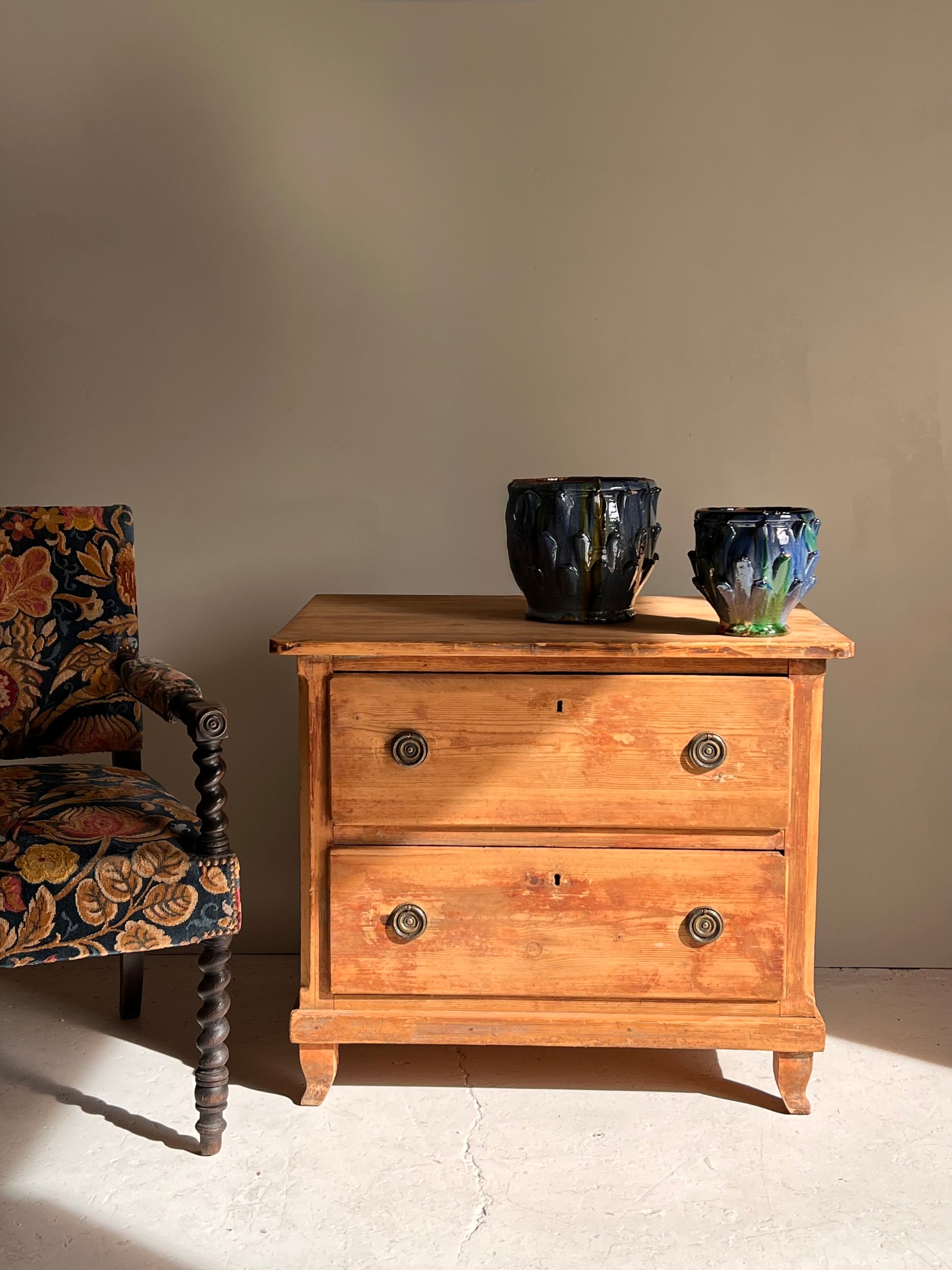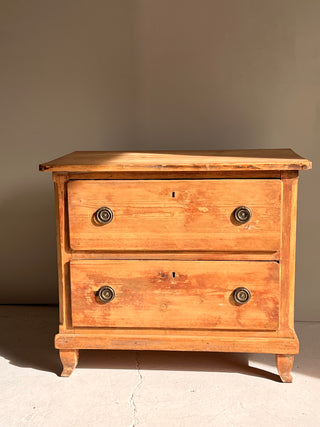 Cómoda de origen belga del S.XIX,  realizada en madera de pino maciza, con dos amplios cajones de frente sencillo y tiradores metálicos circulares originales. Su diseño sobrio y funcional refleja la estética del norte de Europa en el siglo XIX, donde la robustez y la practicidad se combinan con líneas limpias y elegantes.  Su tamaño y sencillez la convierten en un mueble ideal como mesita de noche.