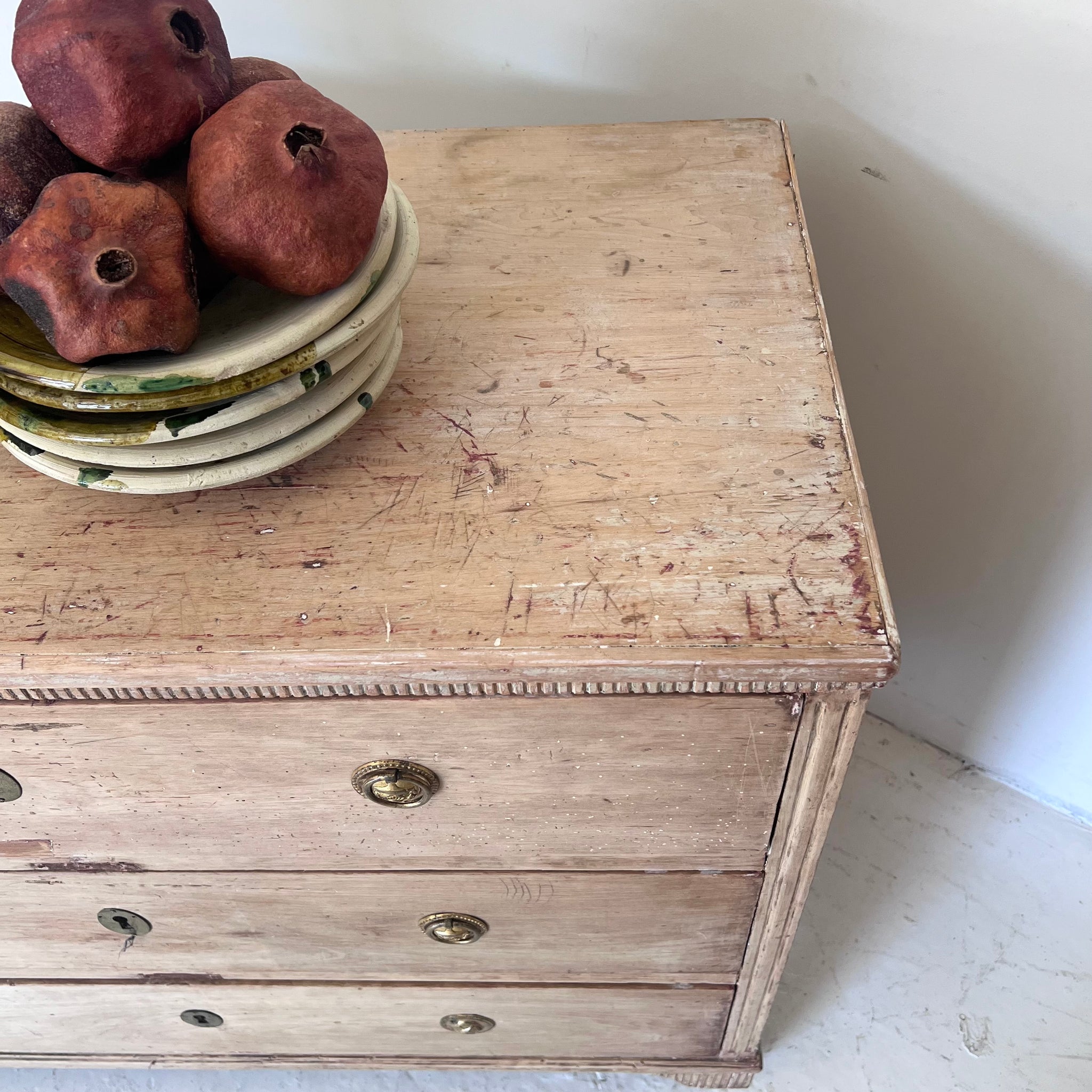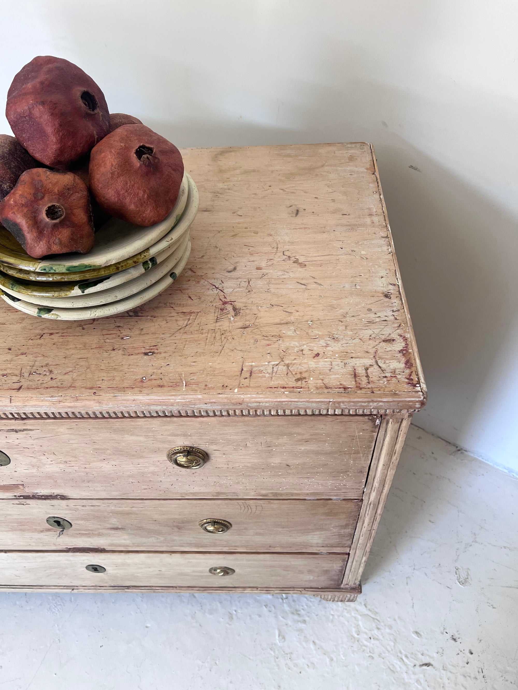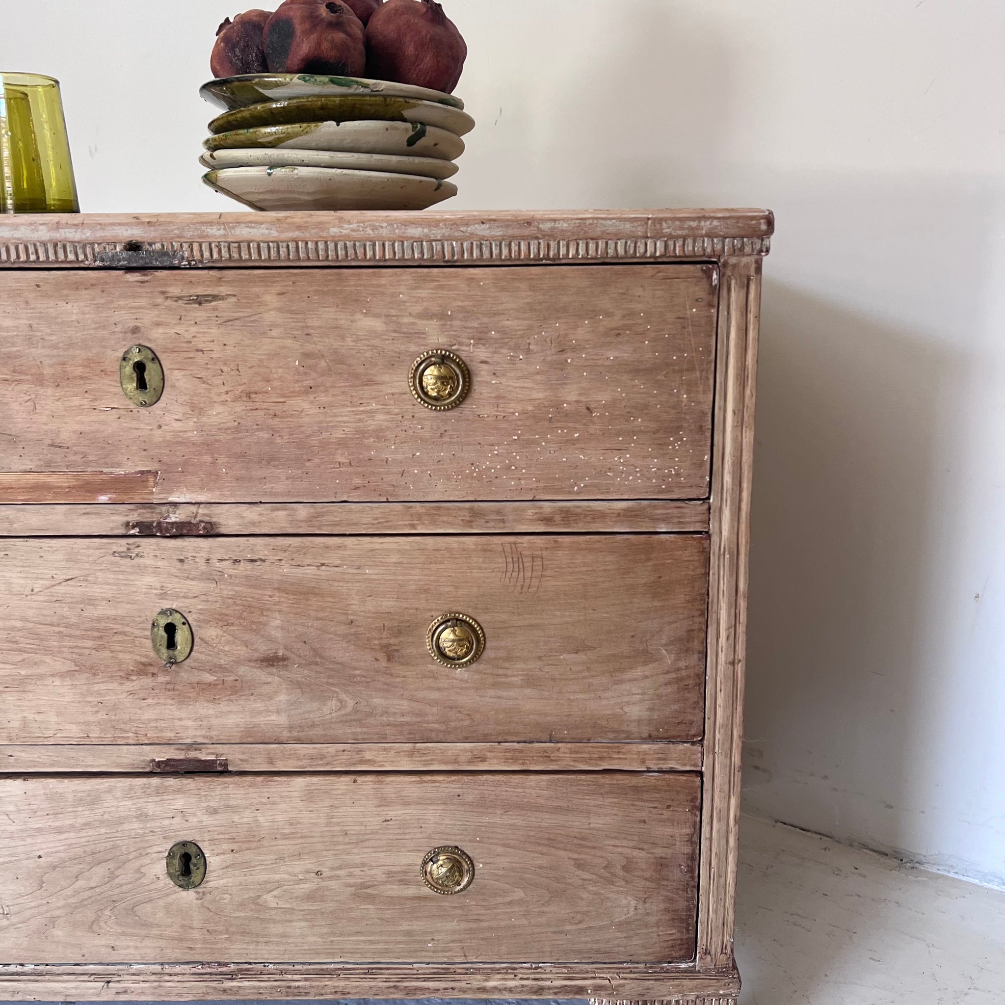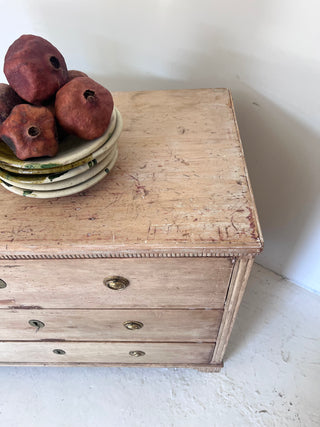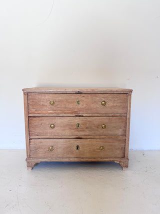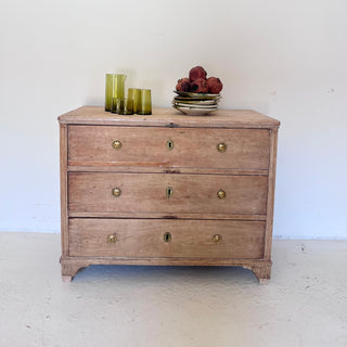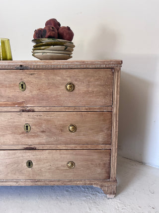 Comoda sueca, de estilo gustaviano, original de S XIX.  De madera de lavada, tiradores de latón y tres cajones. De líneas rectas y acabados suaves, esta pieza combina la sobriedad del estilo clásico con la funcionalidad actual. Los tiradores de latón aportan un detalle elegante y atemporal.