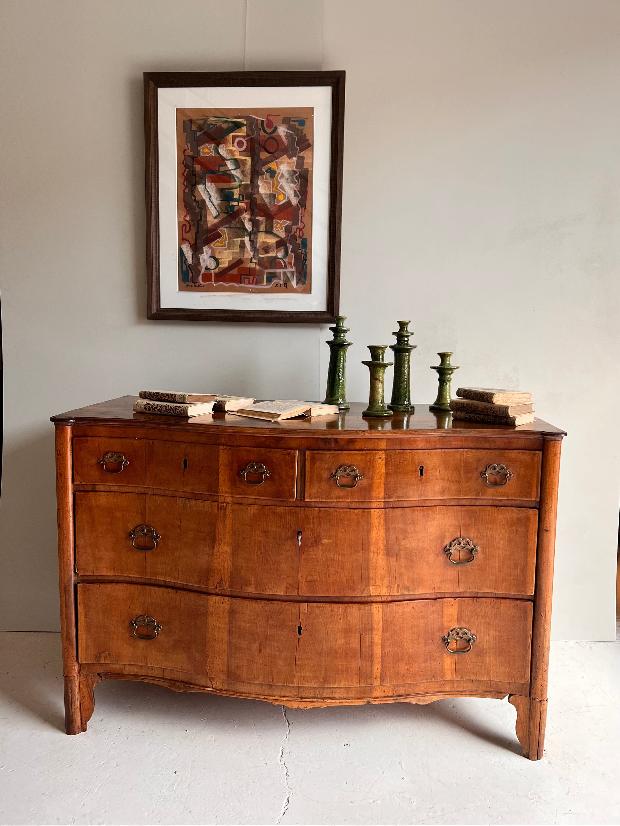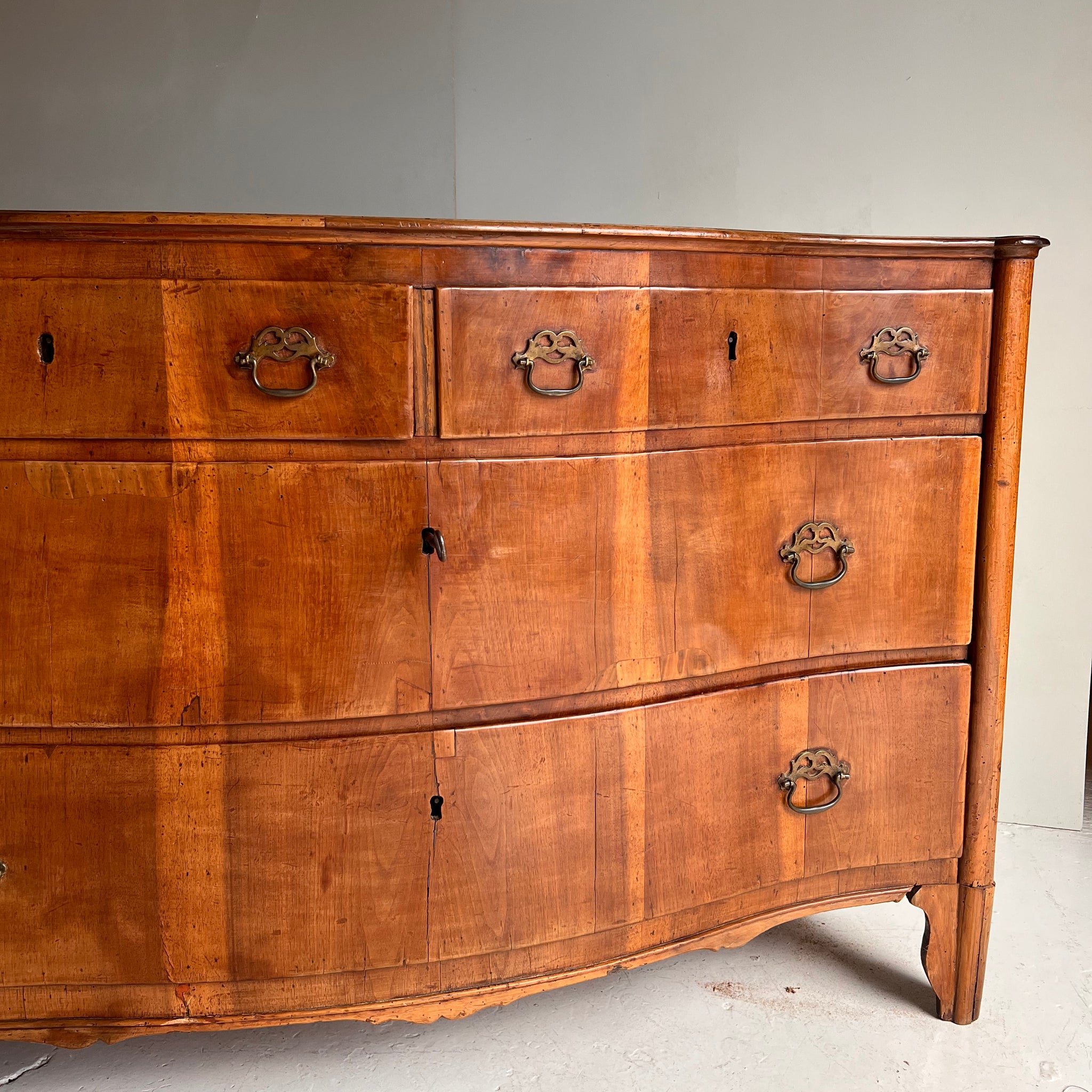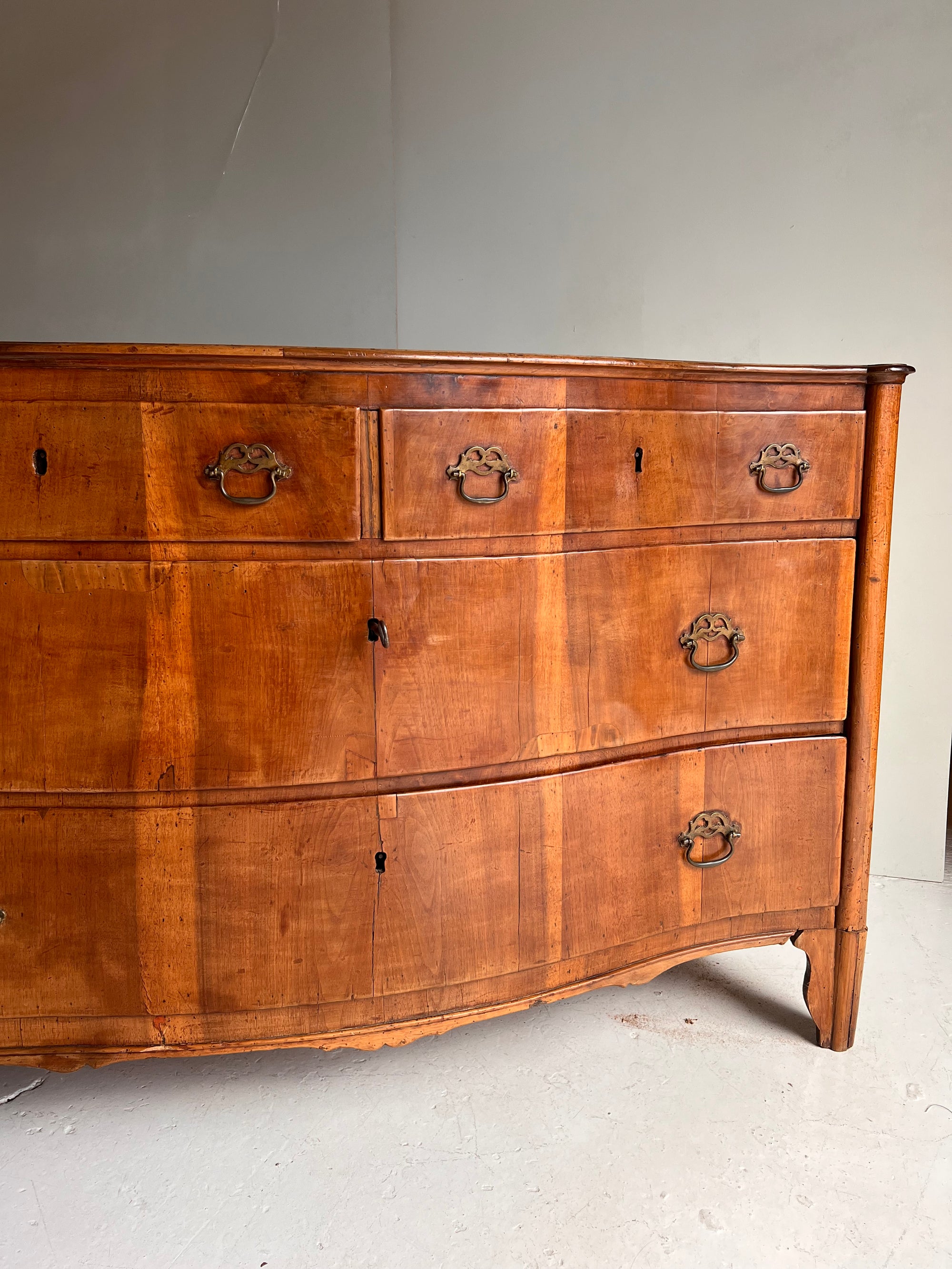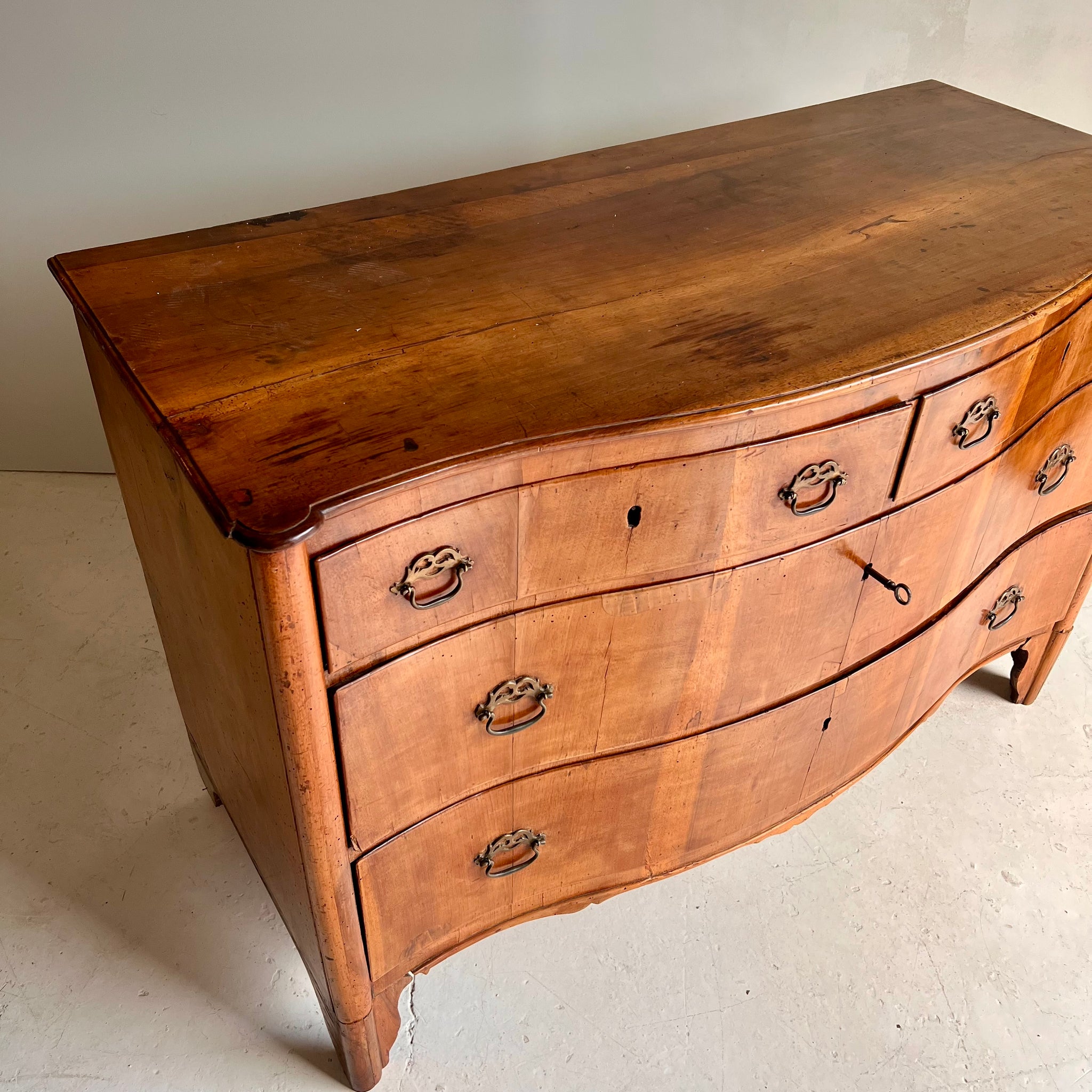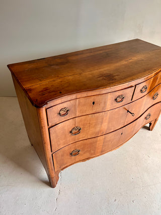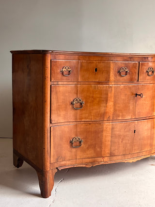 Cómoda italiana del siglo XIX con cuatro cajones. De forma ligeramente curva, presenta dos cajones superiores más pequeños y dos inferiores amplios. Su diseño combina proporciones equilibradas y elegancia artesanal, reflejando el carácter refinado de la ebanistería italiana de la época.