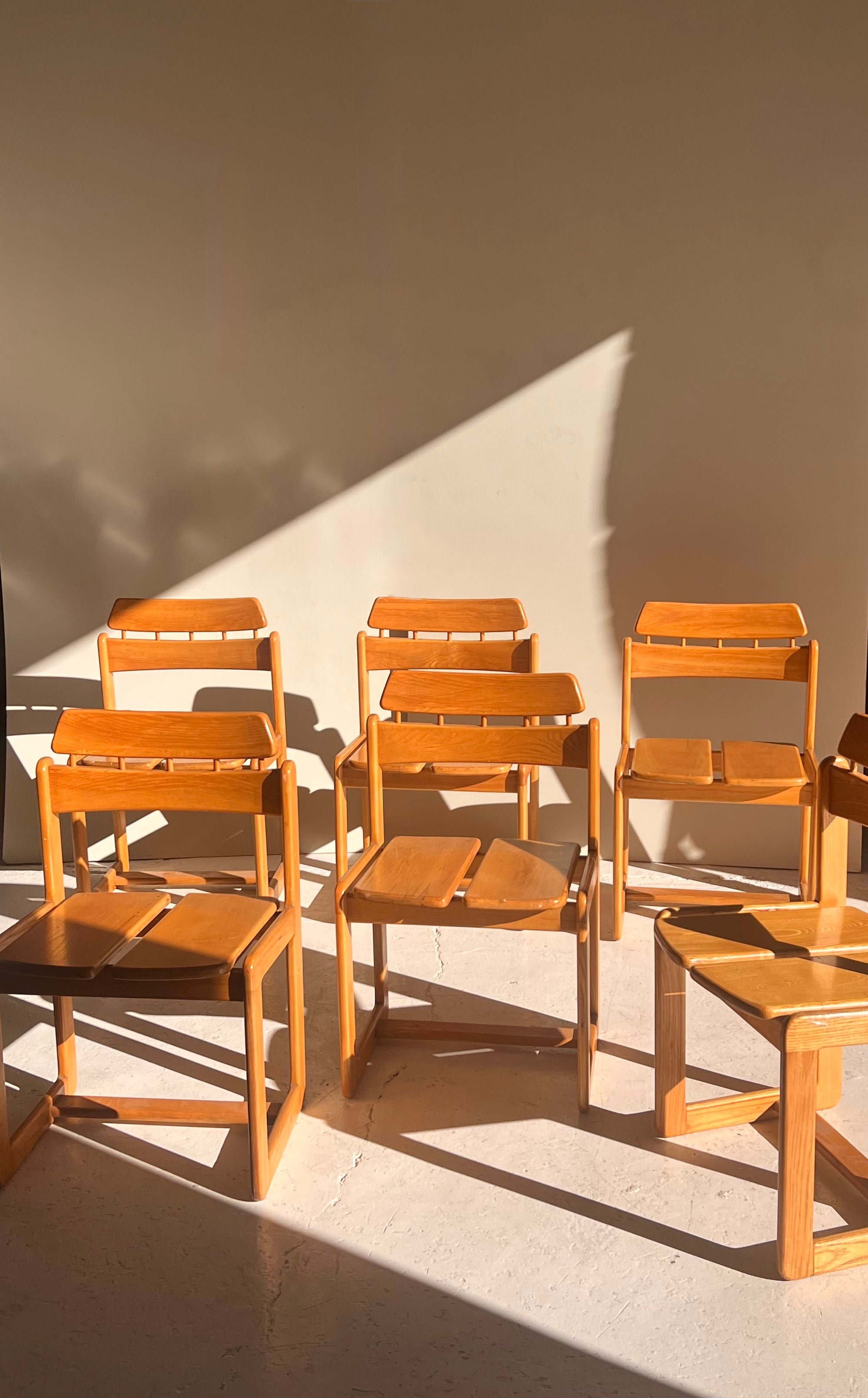 Juego de 6 sillas modelo Tapiolina, del diseñador finlandés Ilmari Tapiovaara. Son de madera de fresno, originales de los anos 70, Italia diseñadas para Fratelli Montina.