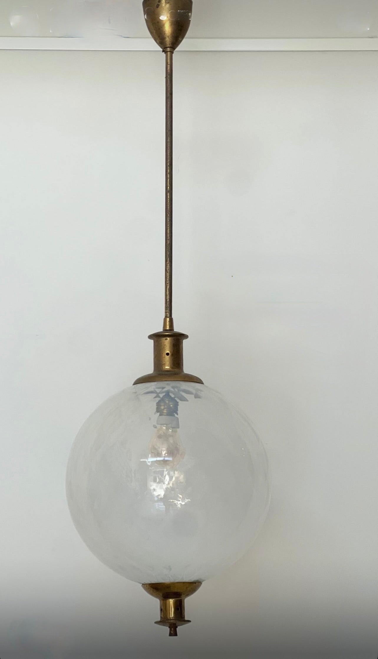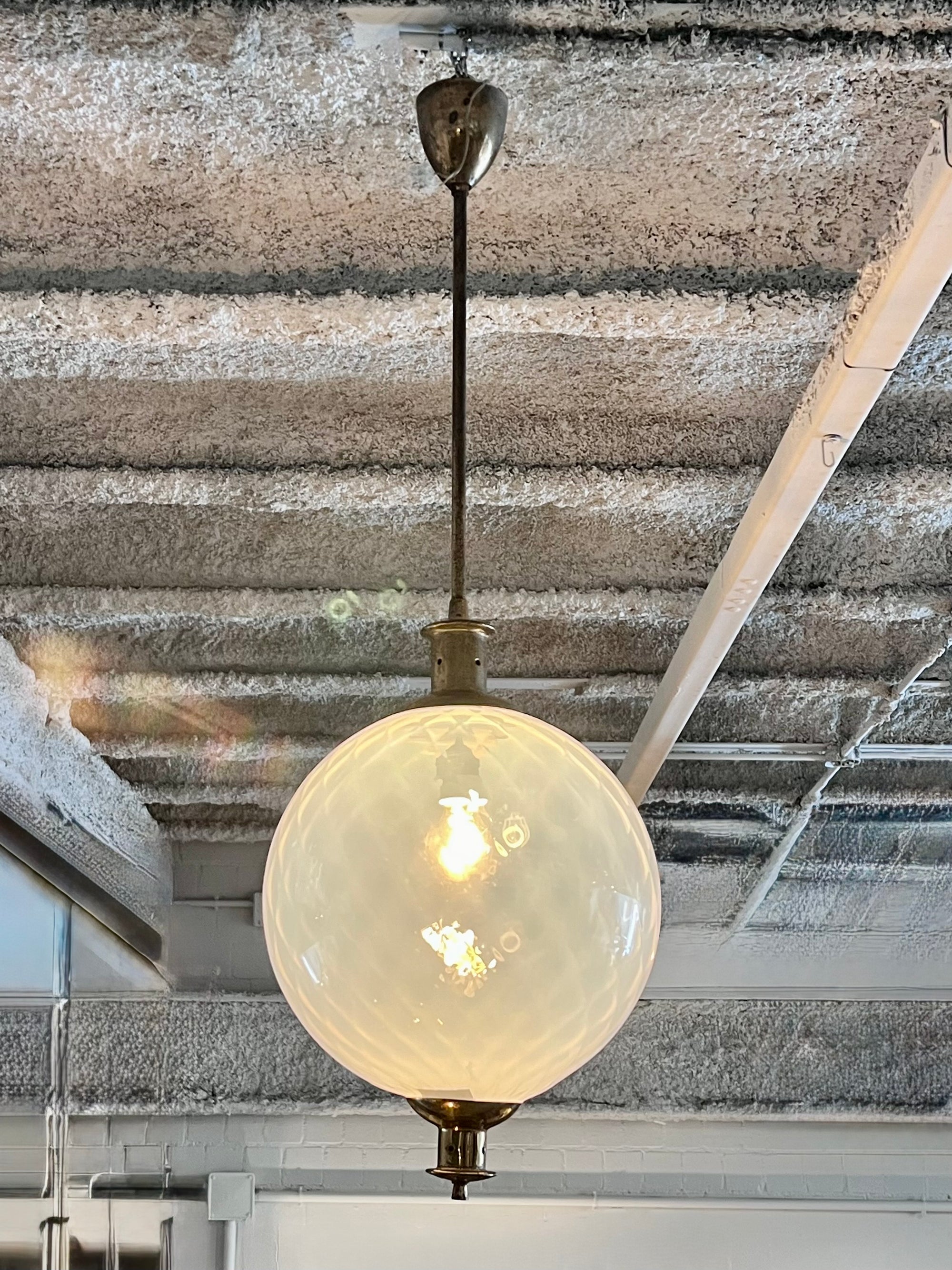 Está compuesta por una gran tulipa esférica de vidrio soplado en tono blanco traslúcido, con delicadas irregularidades propias del trabajo artesanal en vidrio de Murano, que aportan textura y profundidad cuando la luz está encendida. La estructura es de latón, con una elegante pátina envejecida que realza su autenticidad y encanto vintage.