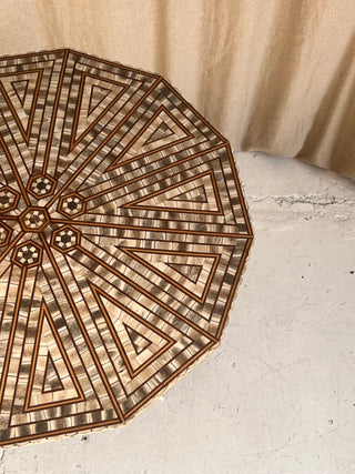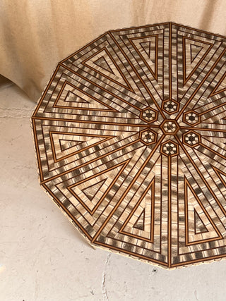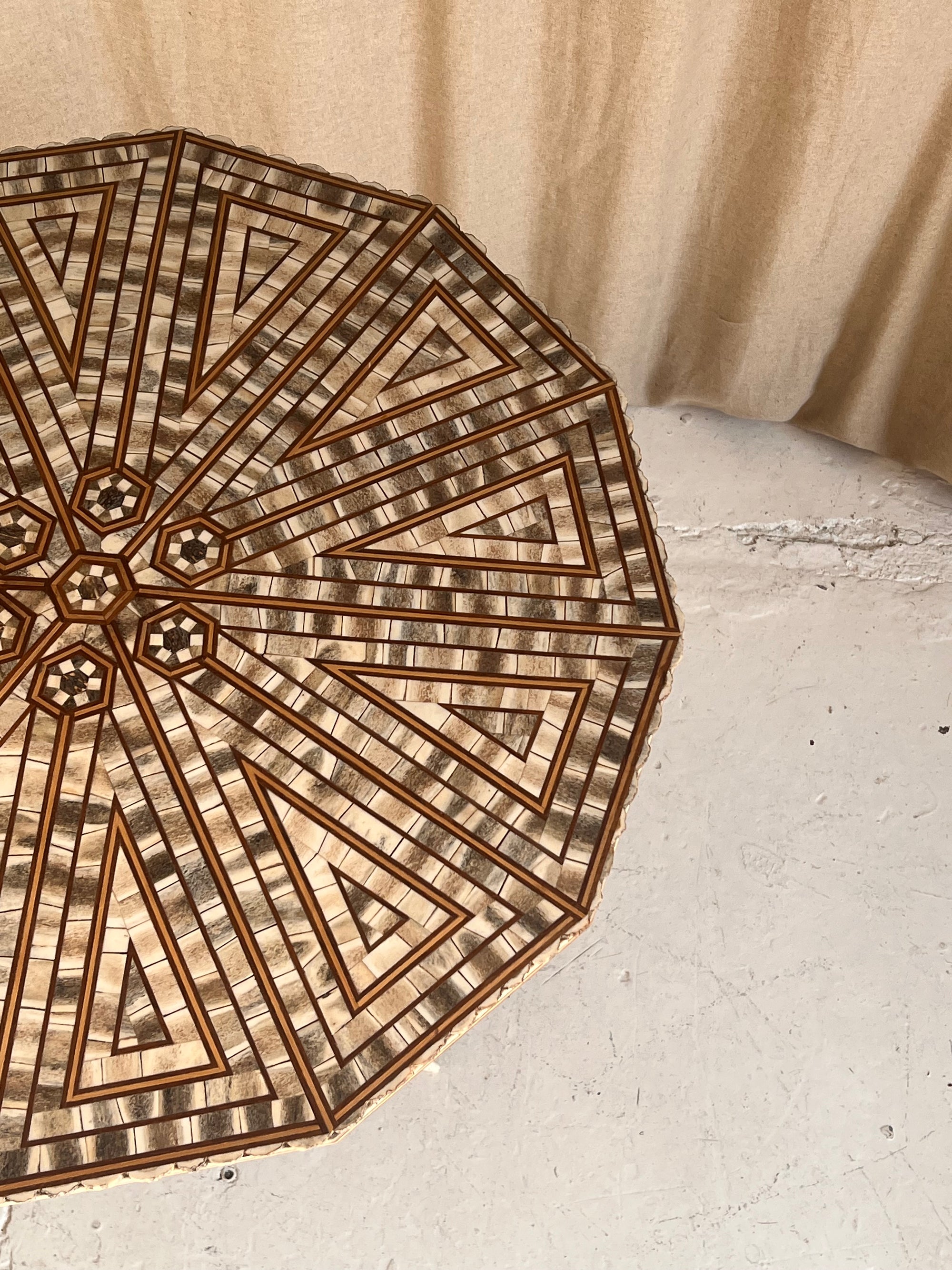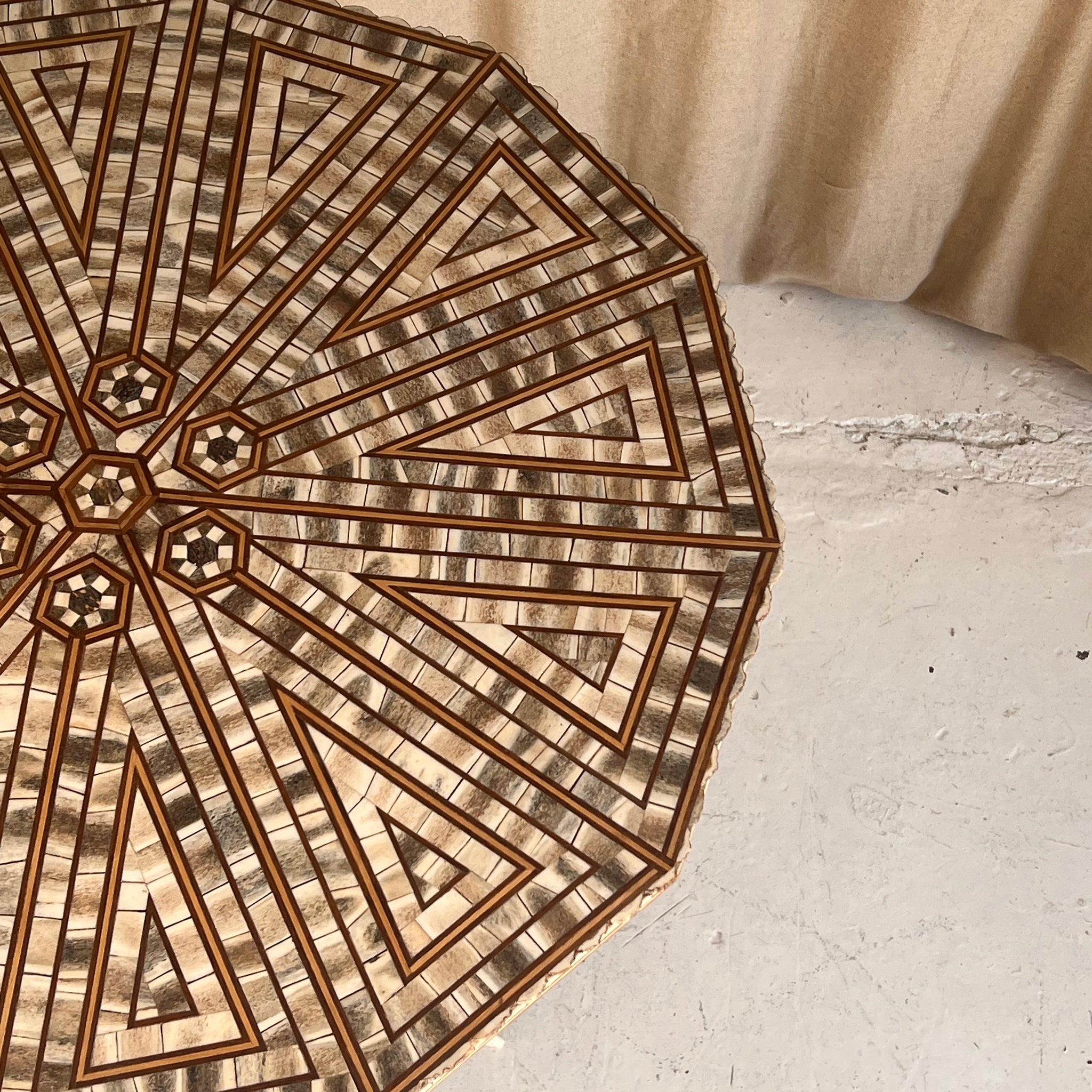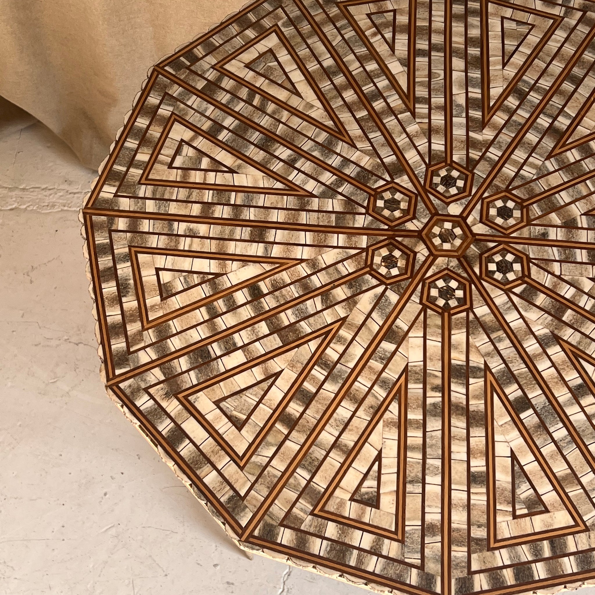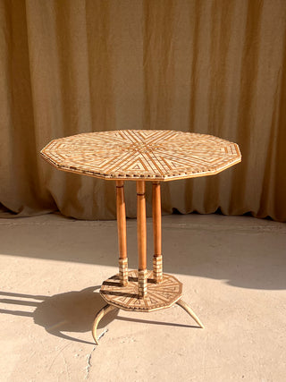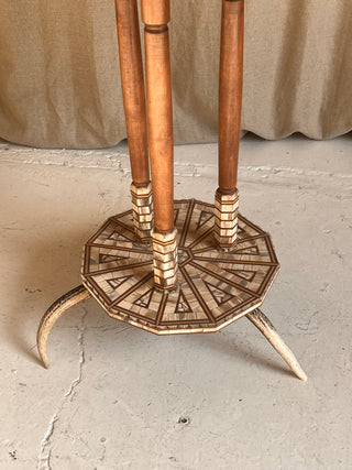 Mesa auxiliar de origen alemán realizada con estructura en asta natural y rica marquetería de hueso formando complejos motivos geométricos en tablero y base. La pieza presenta diseño octogonal tanto en el sobre como en la repisa inferior, con tres columnas de madera torneada que unen ambos niveles y patas en asta curvada. Este tipo de mobiliario artesanal, muy apreciado en la mitad del siglo XX, combina materiales nobles y técnicas tradicionales para lograr un efecto decorativo único. Es ideal como mesa auxiliar en espacios con estilo ecléctico.