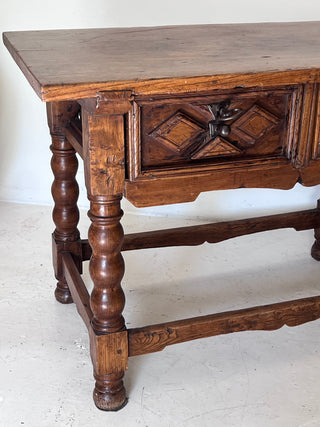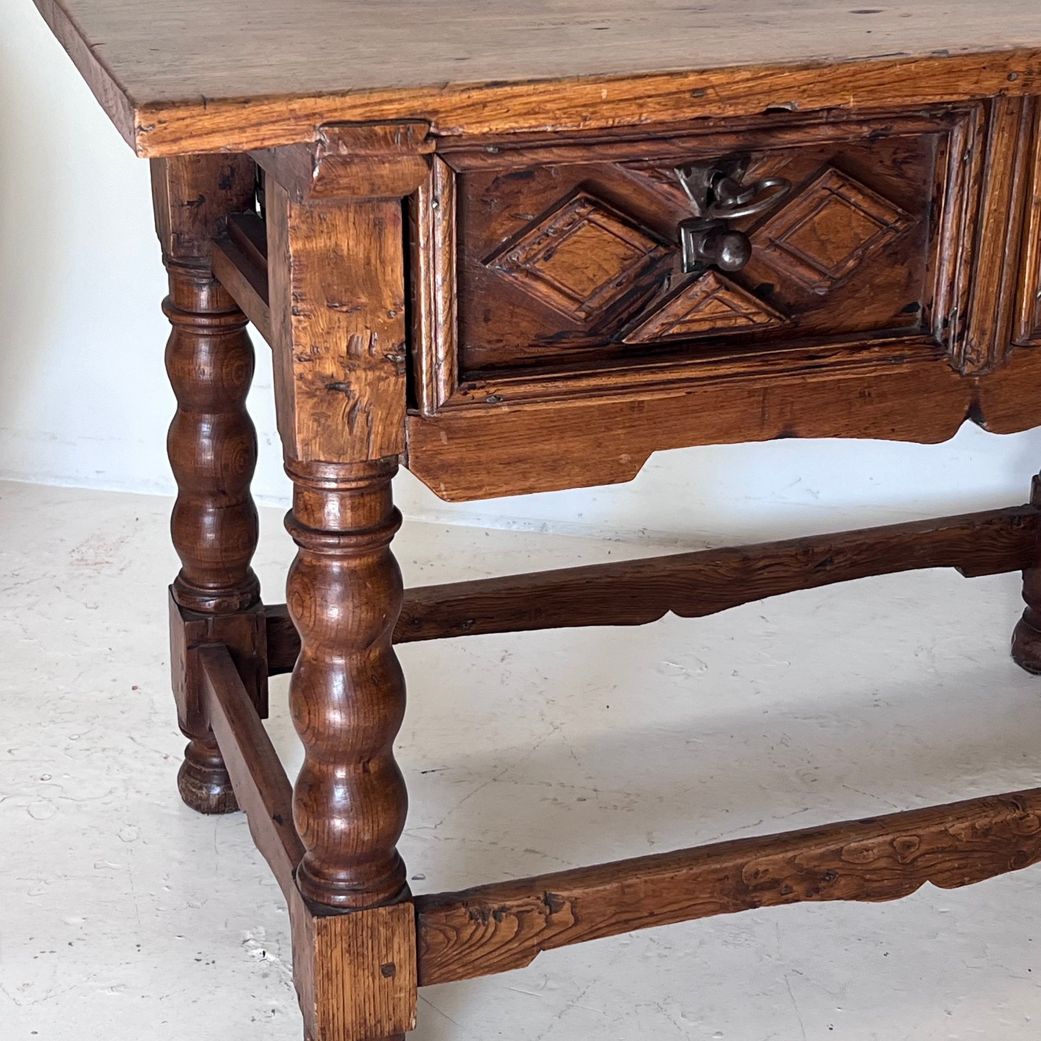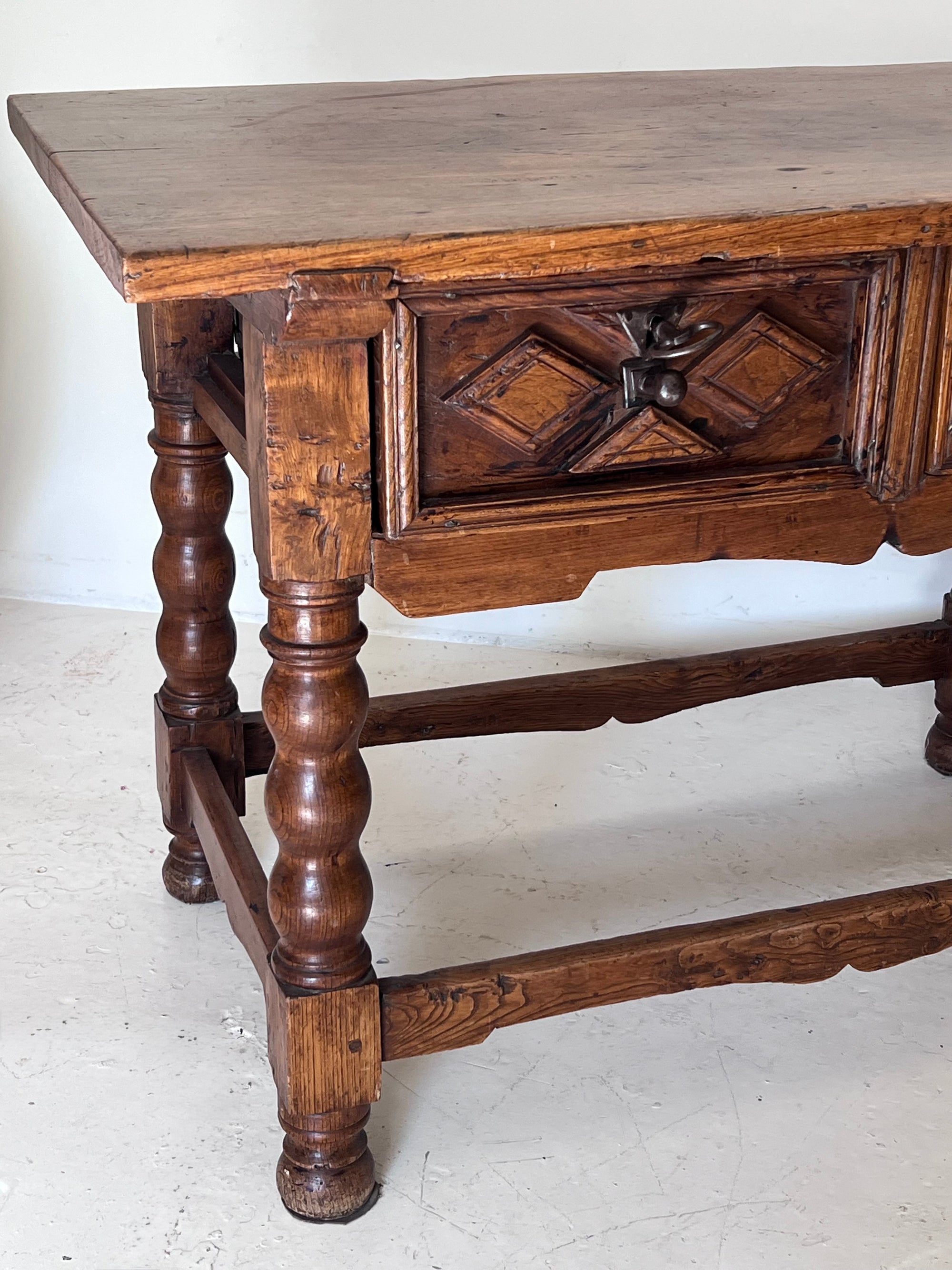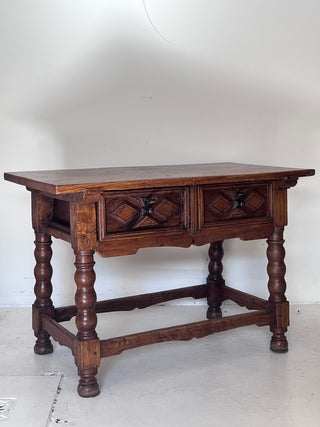 Mesa española, original del S. XVIII,  en madera maciza con dos cajones frontales, decorados con talla geométrica en forma de rombos y herrajes de hierro forjado. Las patas torneadas unidas por travesaños refuerzan su solidez y carácter.