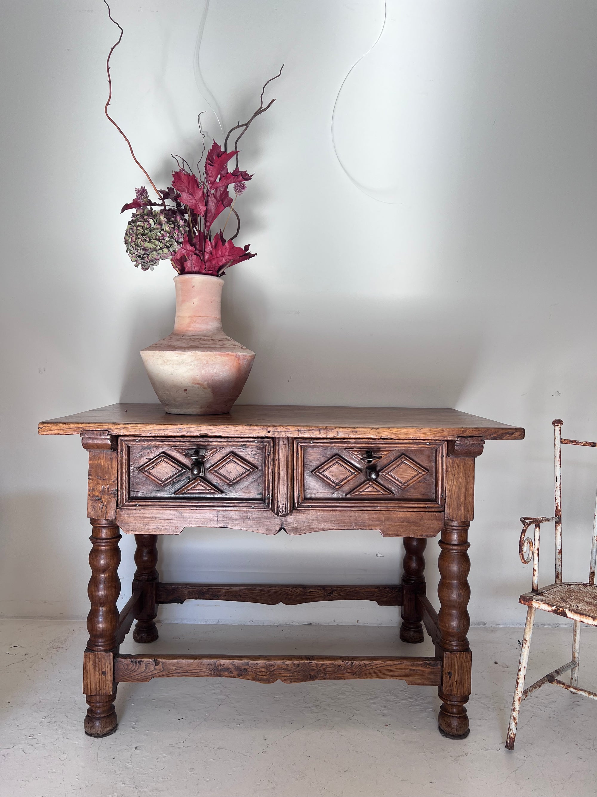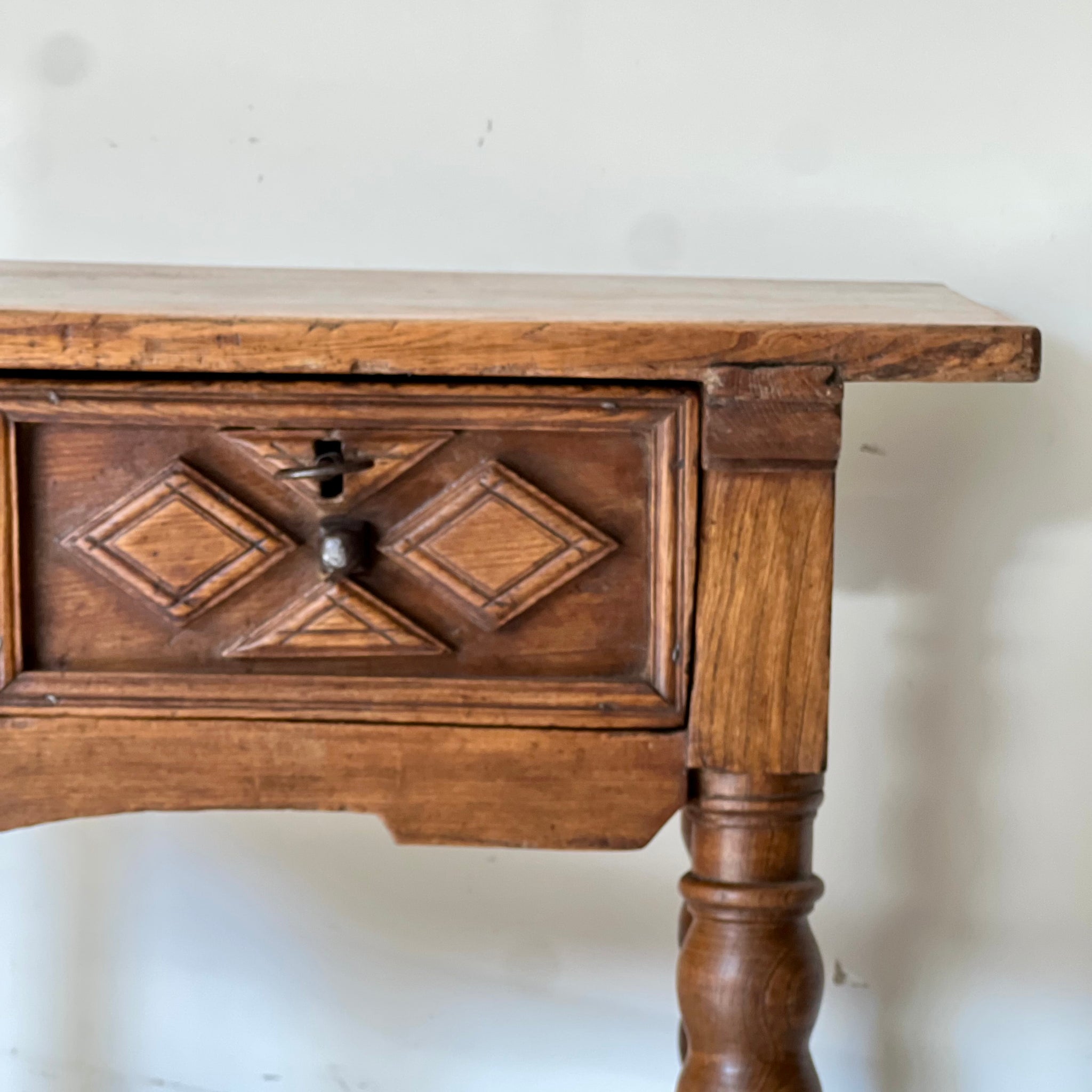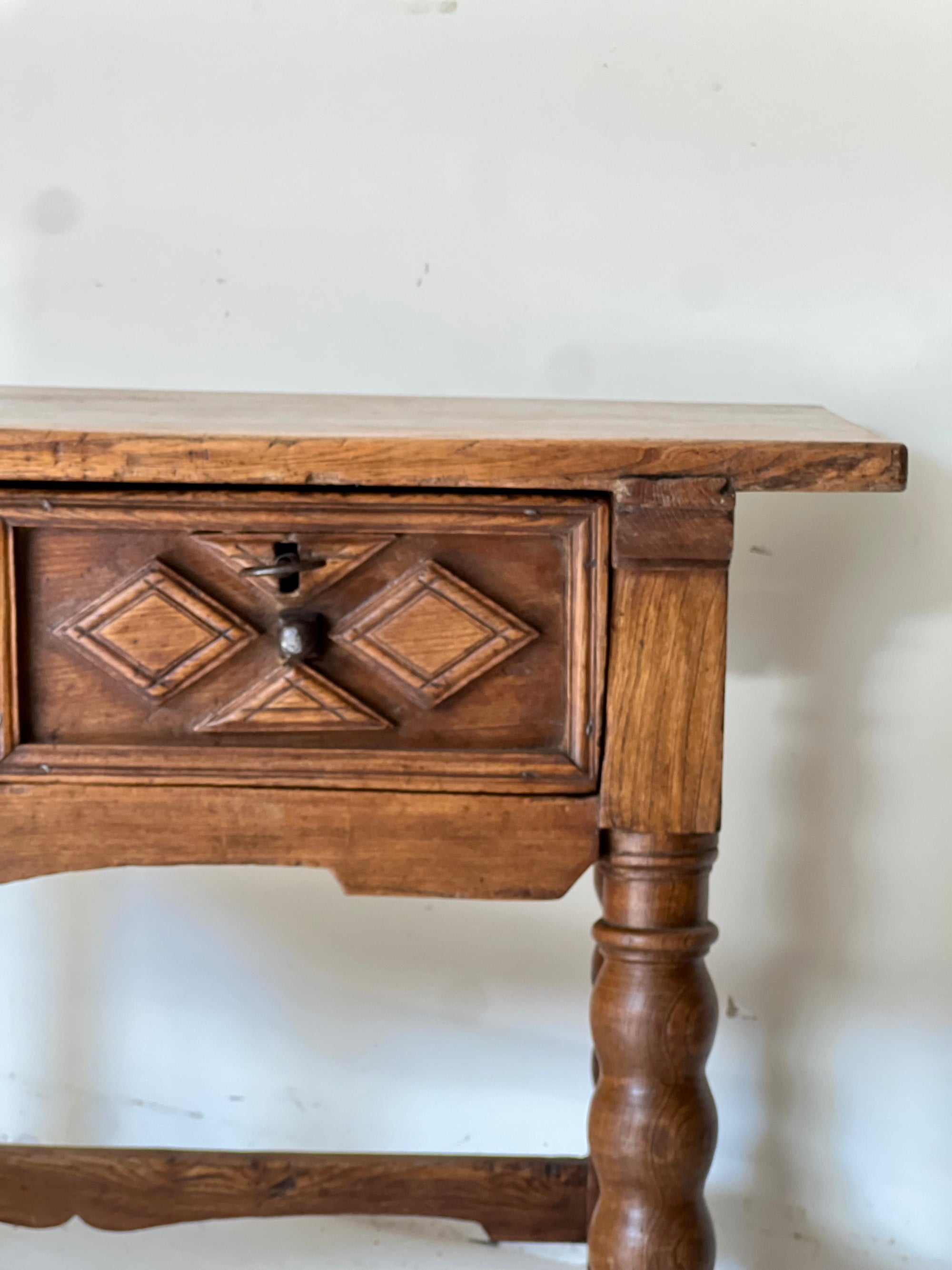 Mesa española, original del S. XVIII,  en madera maciza con dos cajones frontales, decorados con talla geométrica en forma de rombos y herrajes de hierro forjado. Las patas torneadas unidas por travesaños refuerzan su solidez y carácter.
