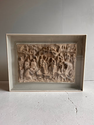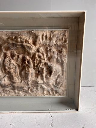 Escultura en relieve de terracota, representa una natividad o escena del nacimiento de Jesús. La obra está enmarcada dentro de una caja o vitrina de madera pintada de blanco, con un cristal protector al frente.