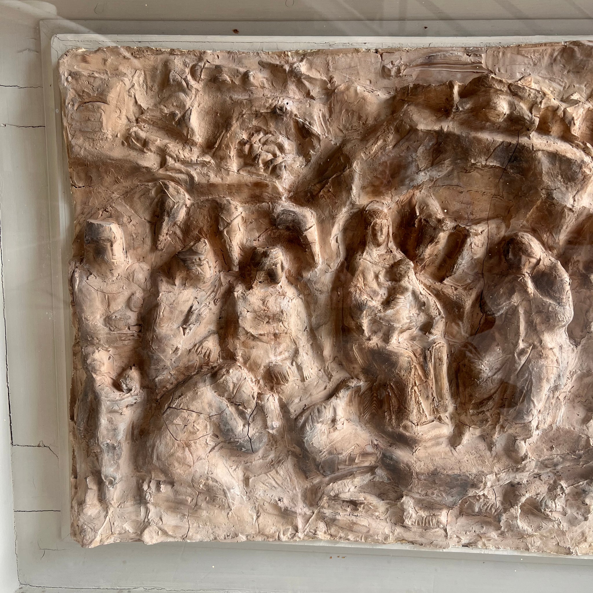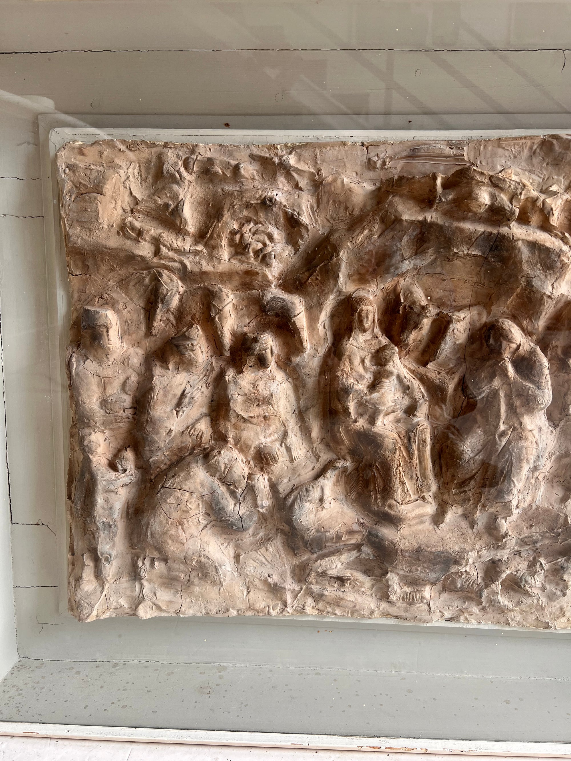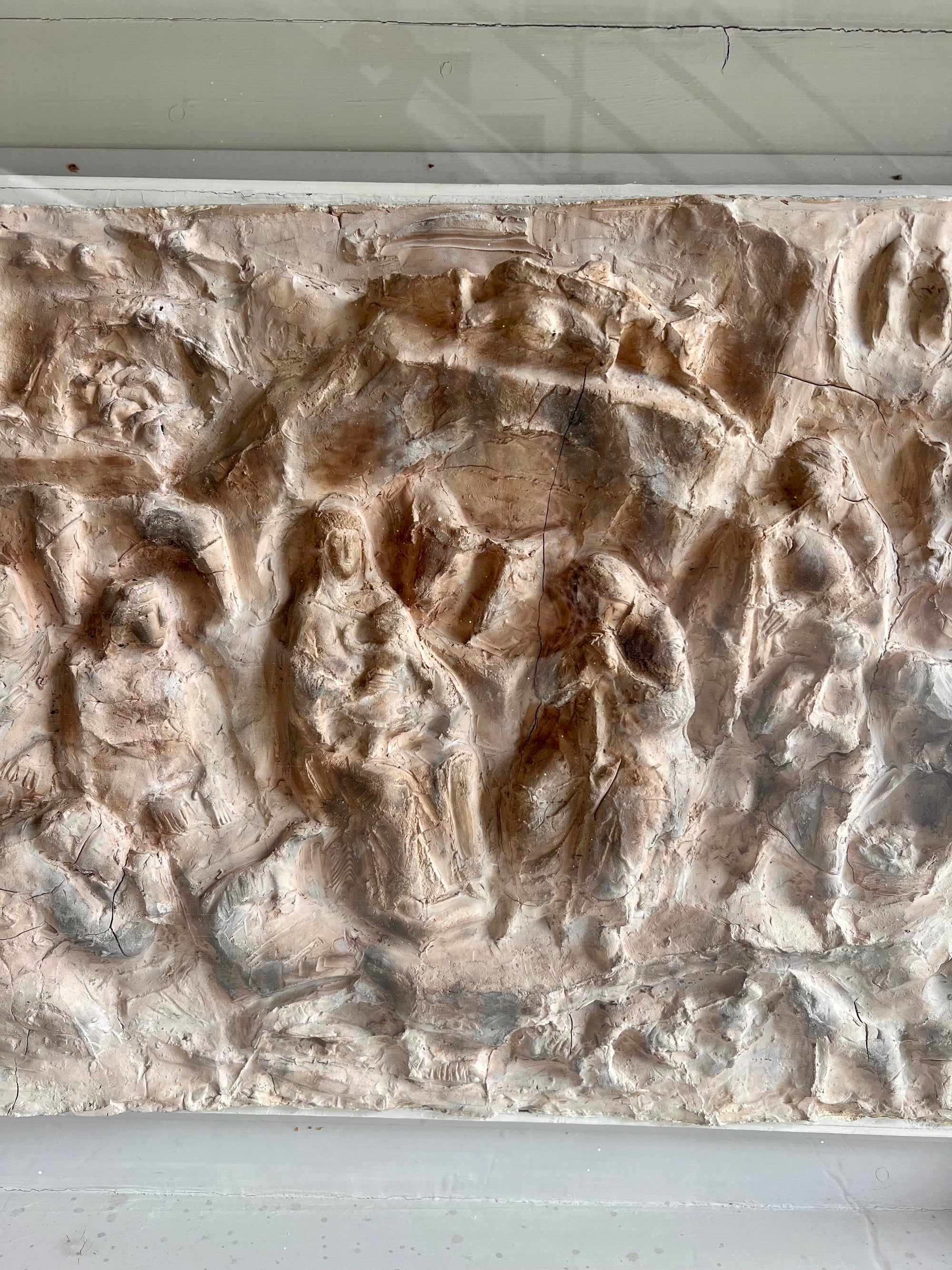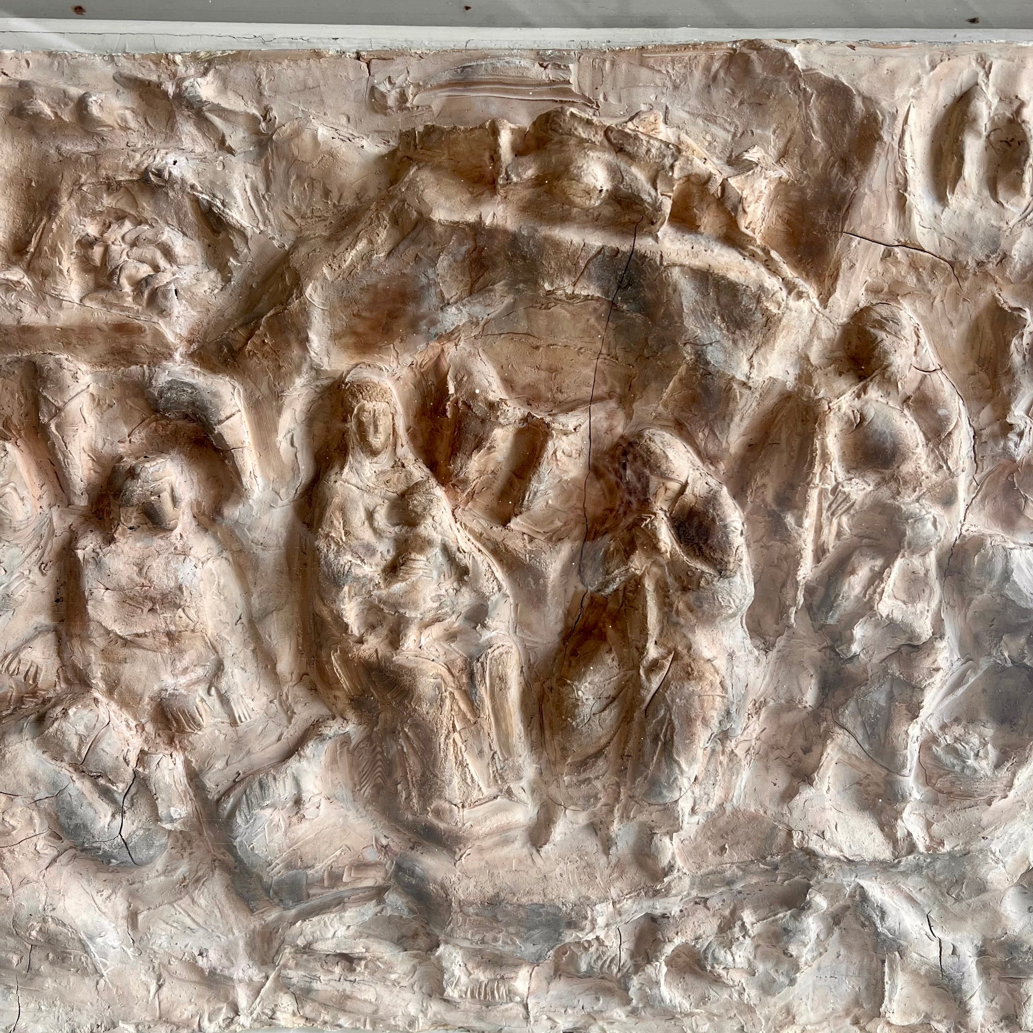 El relieve está modelado en una tonalidad ocre claro o beige, y las figuras aparecen dispuestas en una composición muy densa y expresiva. En el centro se distingue la figura de la Virgen María con el Niño Jesús, flanqueada por otras figuras que probablemente representen a San José, los Reyes Magos y pastores. En la parte superior se observan formas que podrían sugerir ángeles o un fondo celestial.