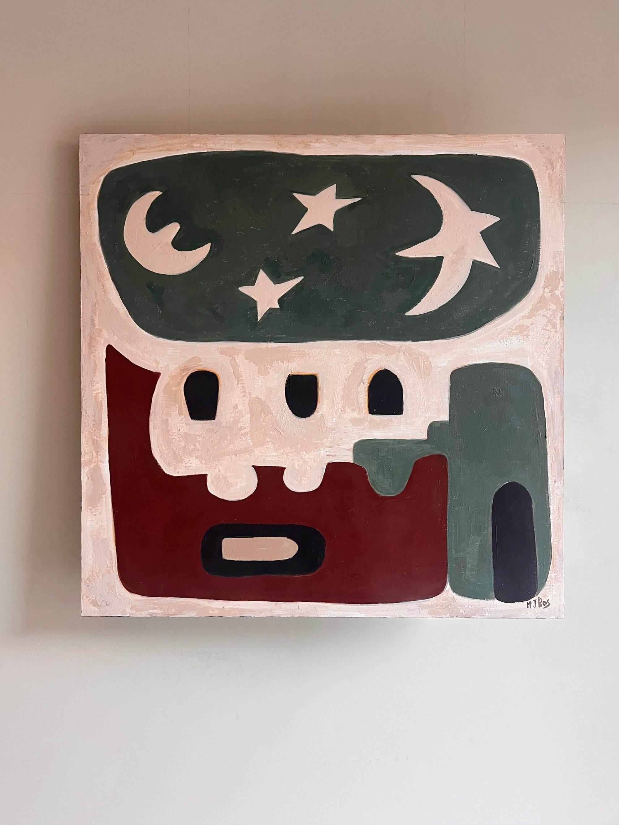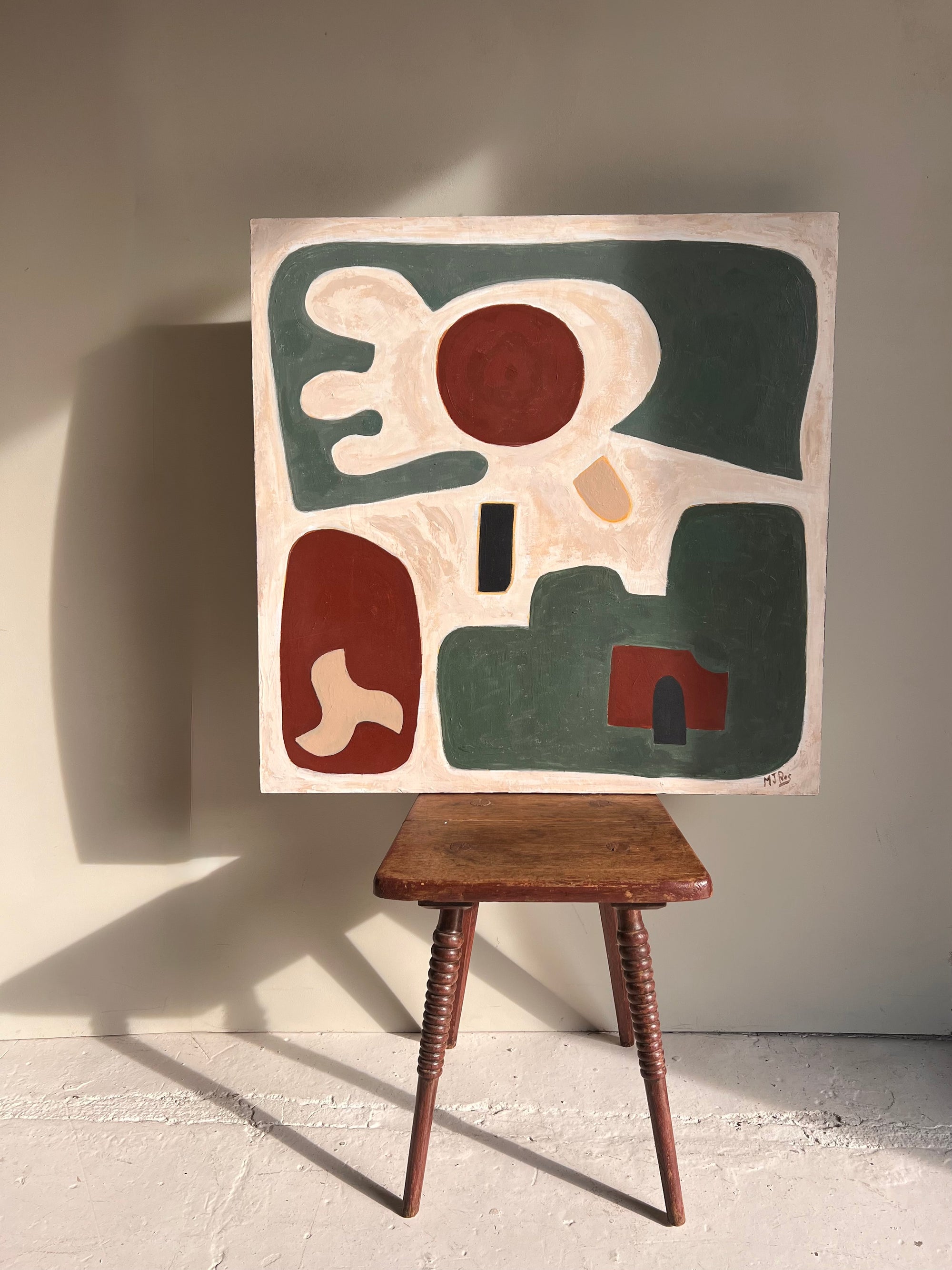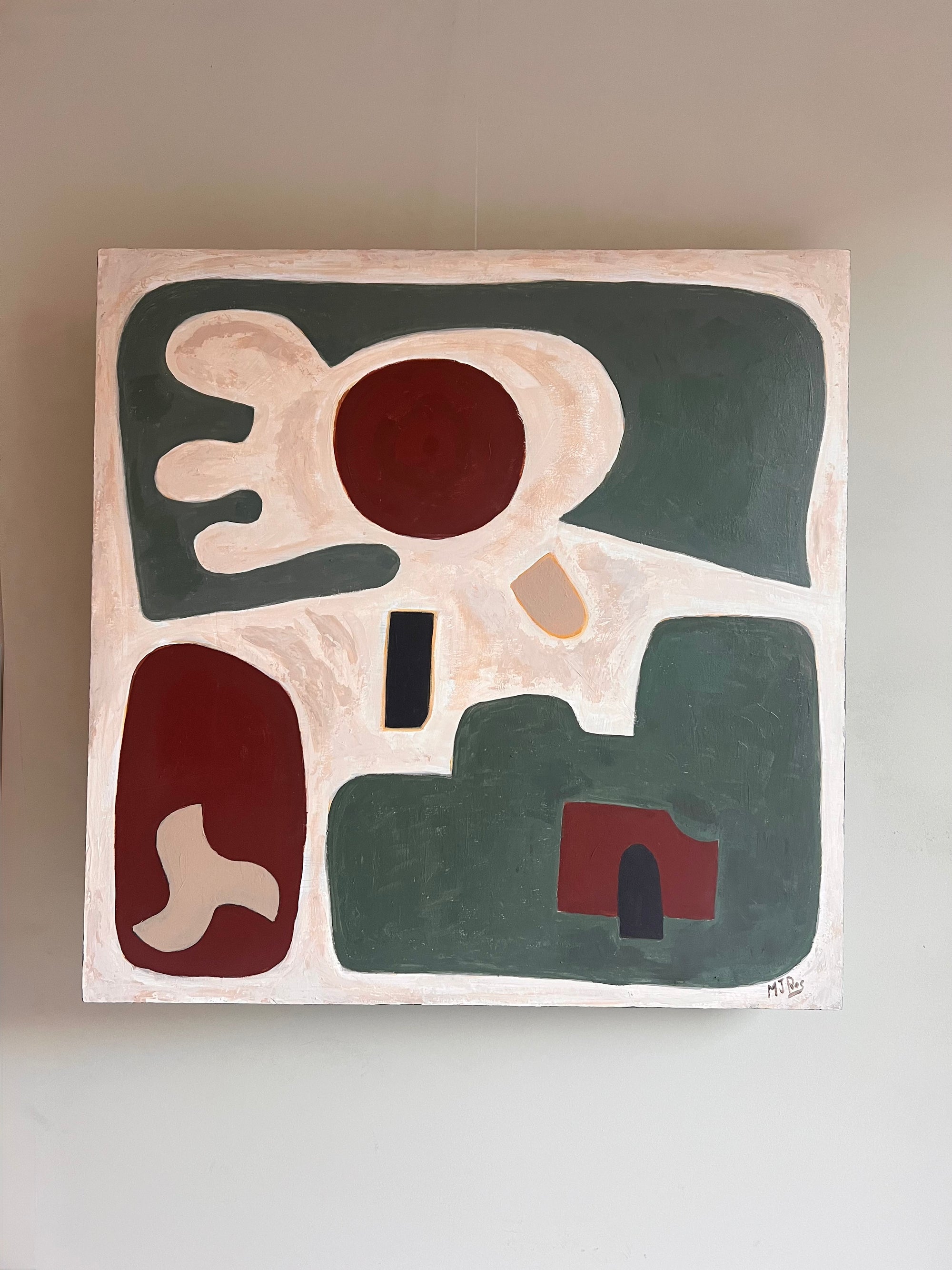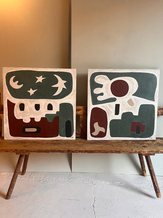 Pareja de obras originales pintadas sobre tabla por la artista María José Ros. Composiciones abstractas de inspiración orgánica y arquitectónica, realizadas con una paleta de tonos terrosos, verdes y rojizos. Las formas simplificadas y el equilibrio cromático crean piezas de gran fuerza visual y serenidad contemporánea.