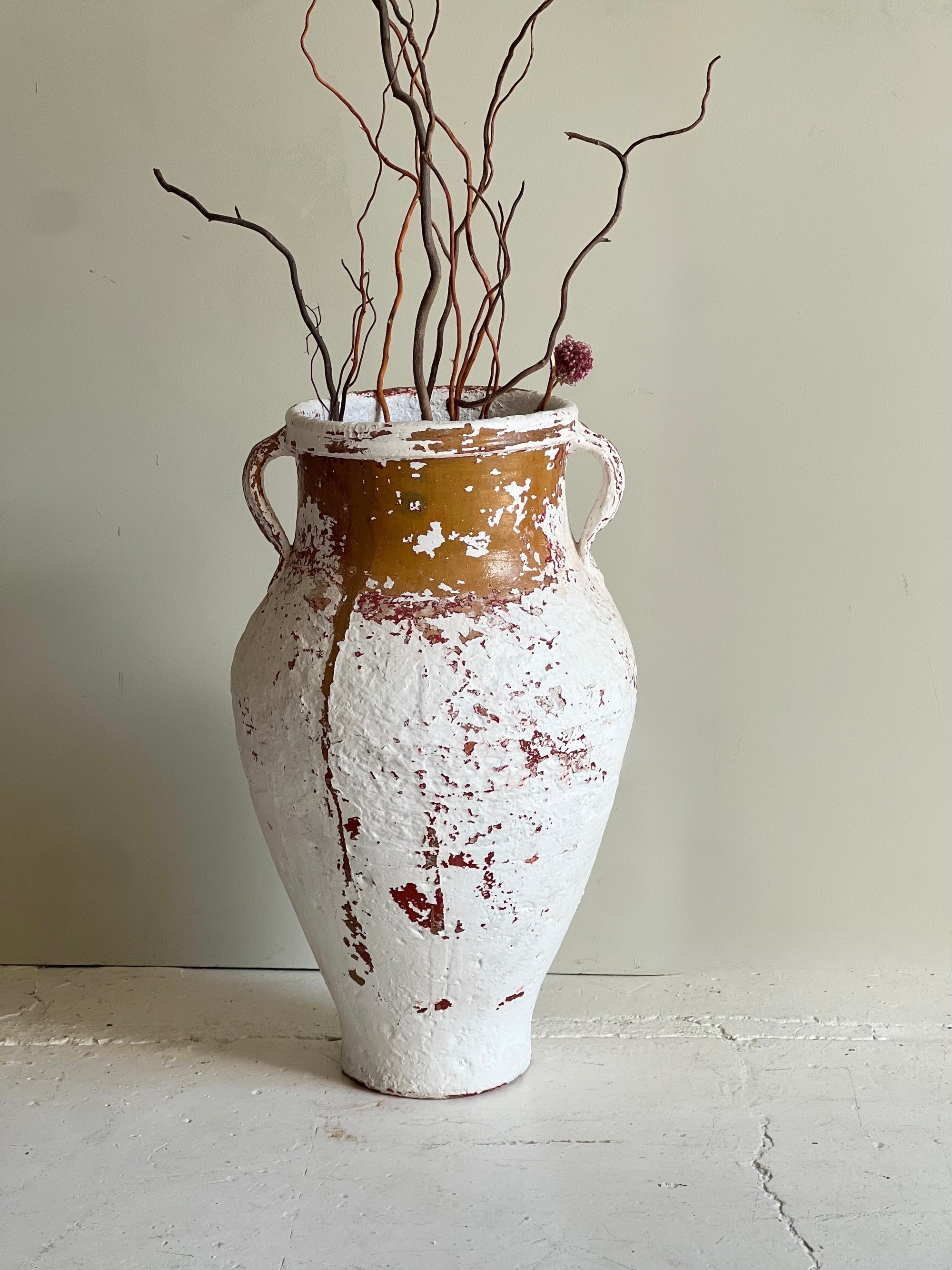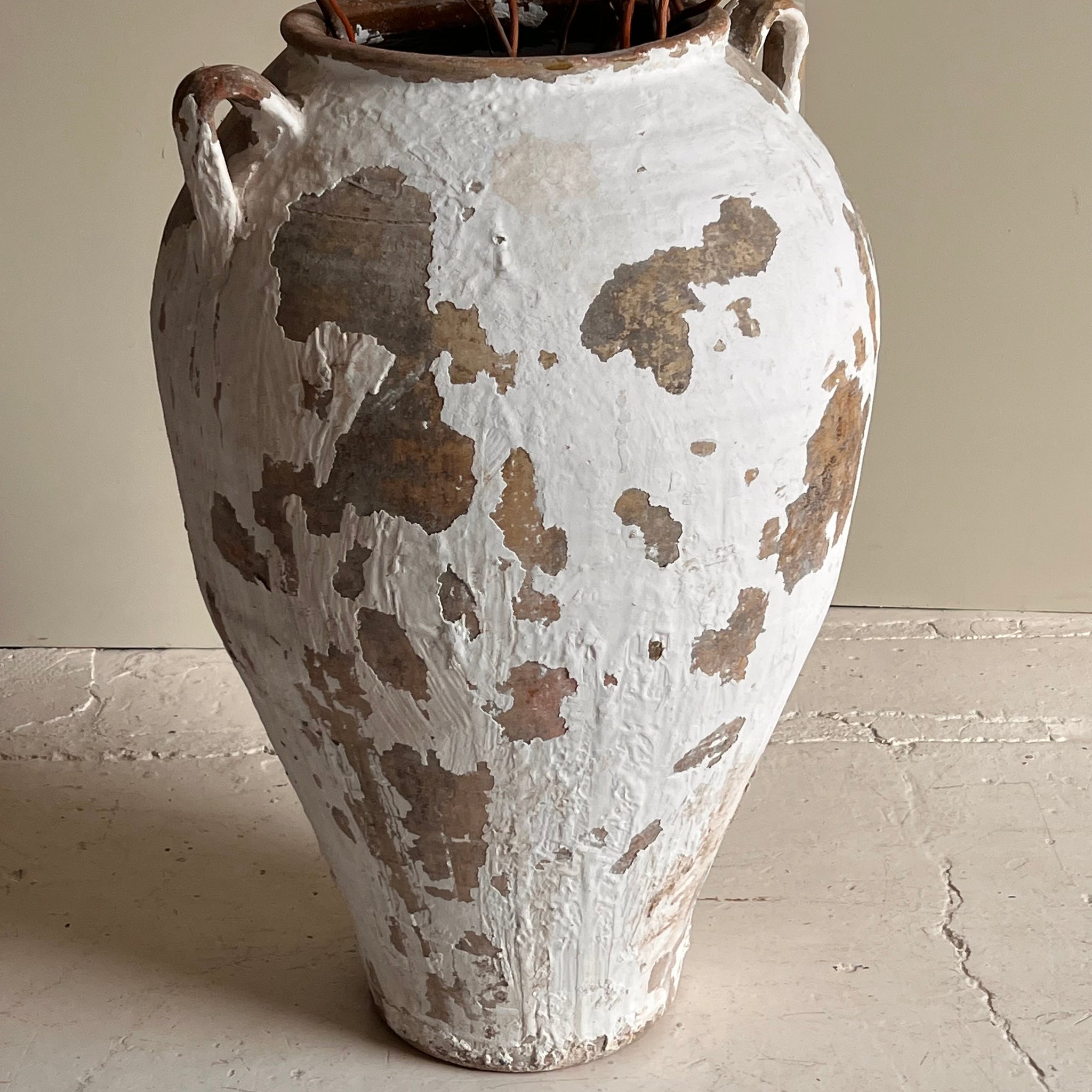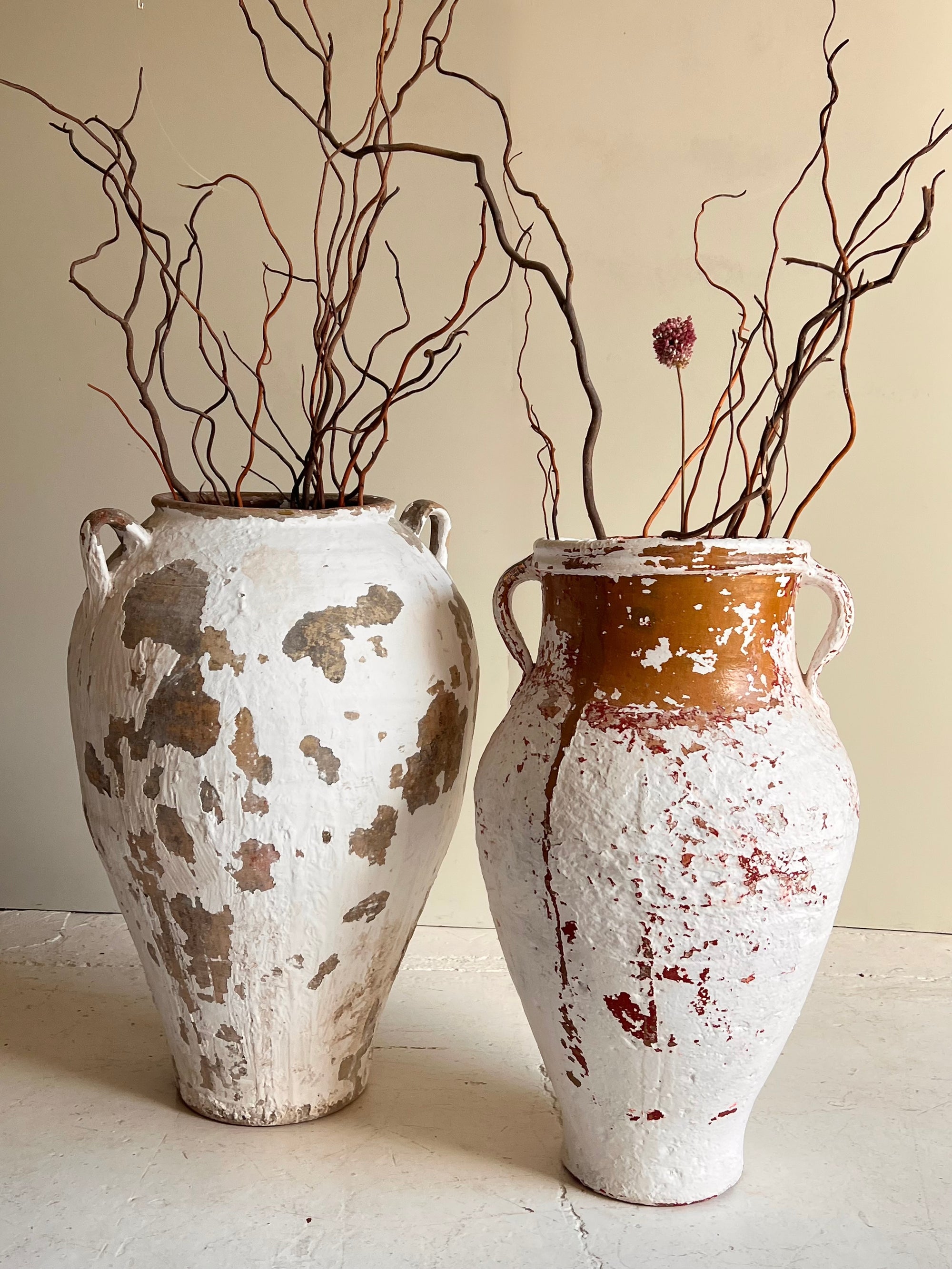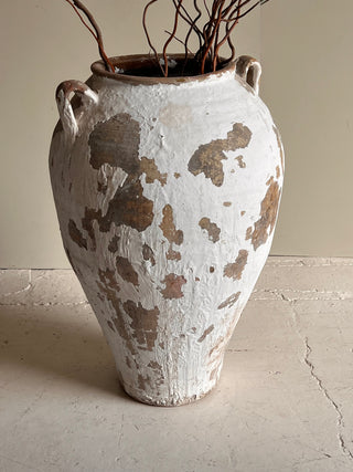 Pareja de tinajas andaluzas antiguas, probablemente de finales del siglo XIX o principios del XX. Imponentes y llenas de historia, esta pareja de tinajas antiguas aporta un encanto rústico y auténtico a cualquier espacio. Elaboradas en barro cocido, conservan su pátina original con restos de pintura blanca y rojiza que evidencian el paso del tiempo, haciendo de cada pieza una obra única. Su superficie desgastada y textura artesanal revelan el carácter propio de la alfarería tradicional del sur de España