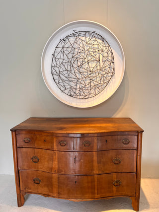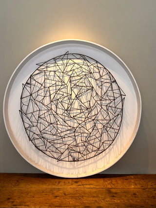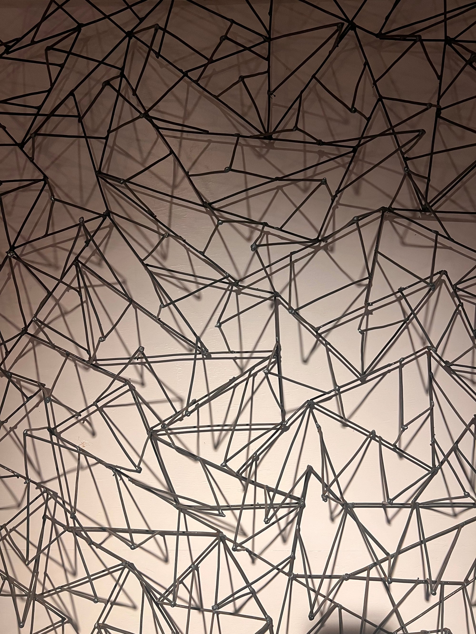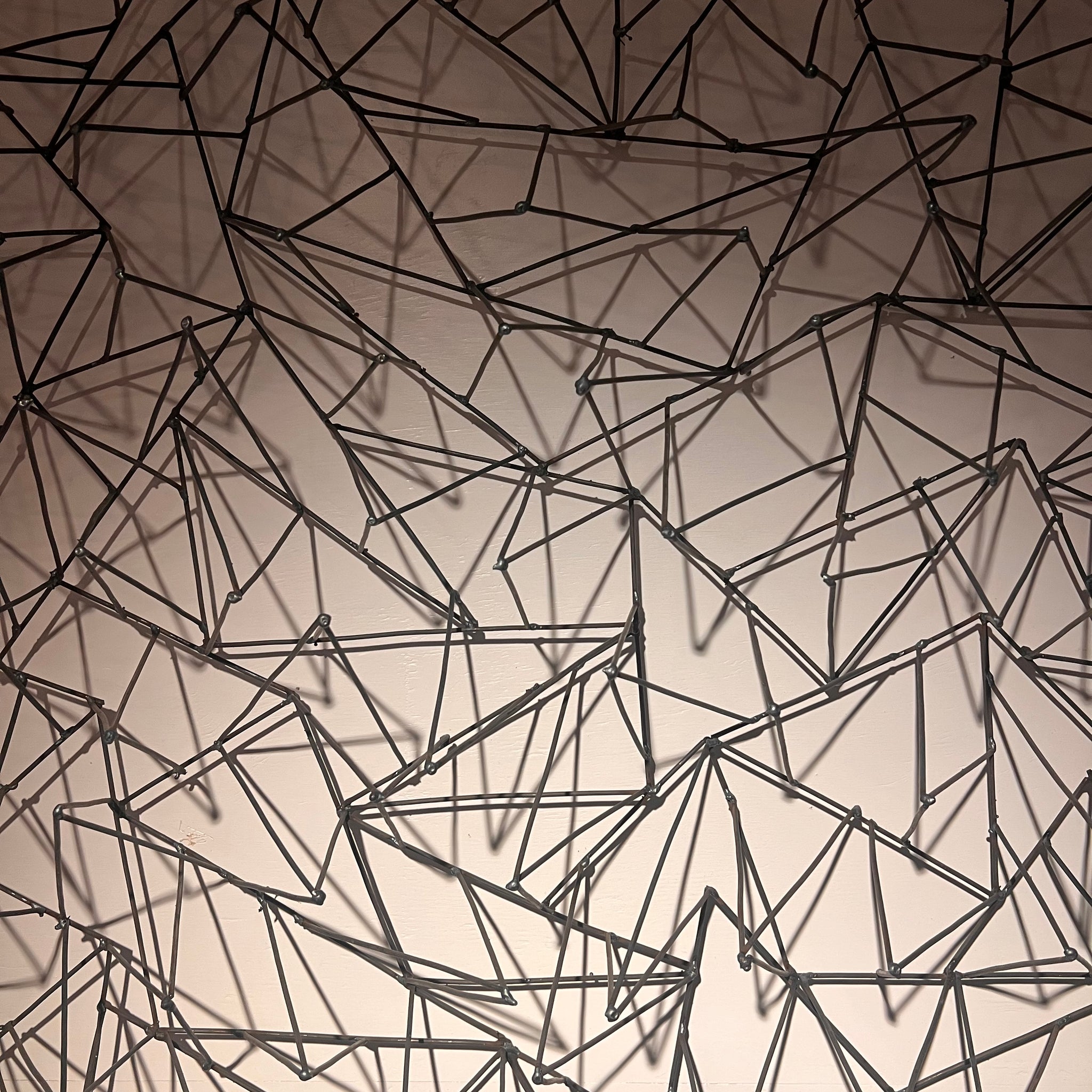 Una red de líneas metálicas se extiende dentro del marco, creando una arquitectura suspendida entre orden y caos. No hay ornamento: solo estructura, vacío y materia.