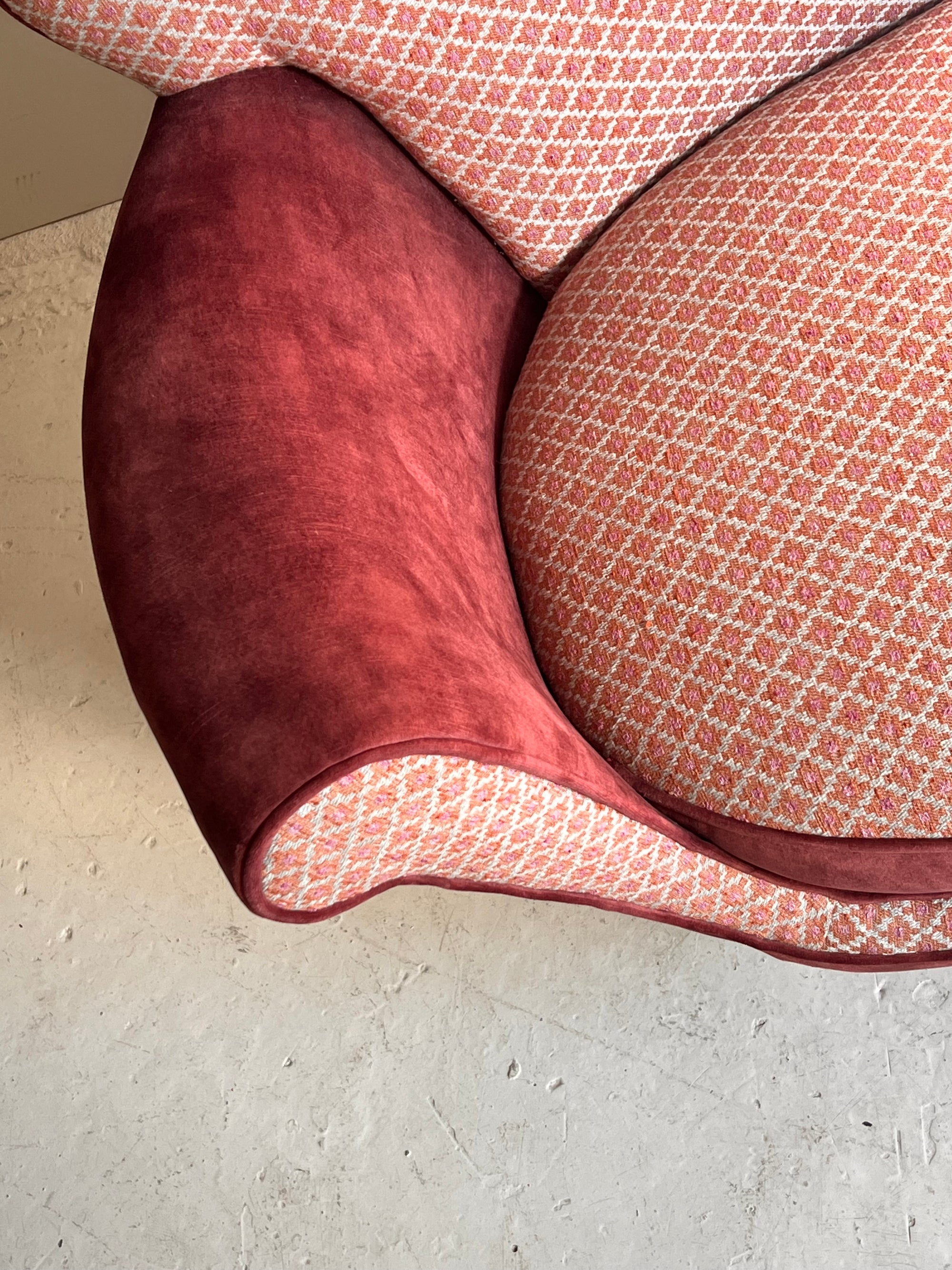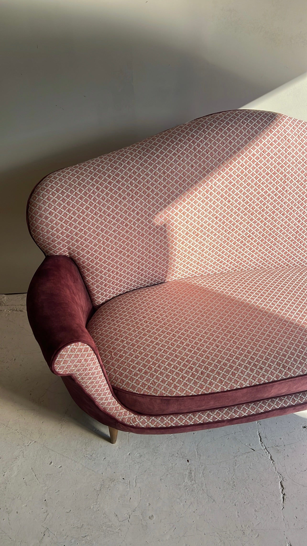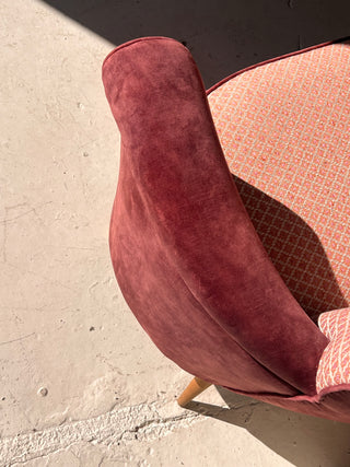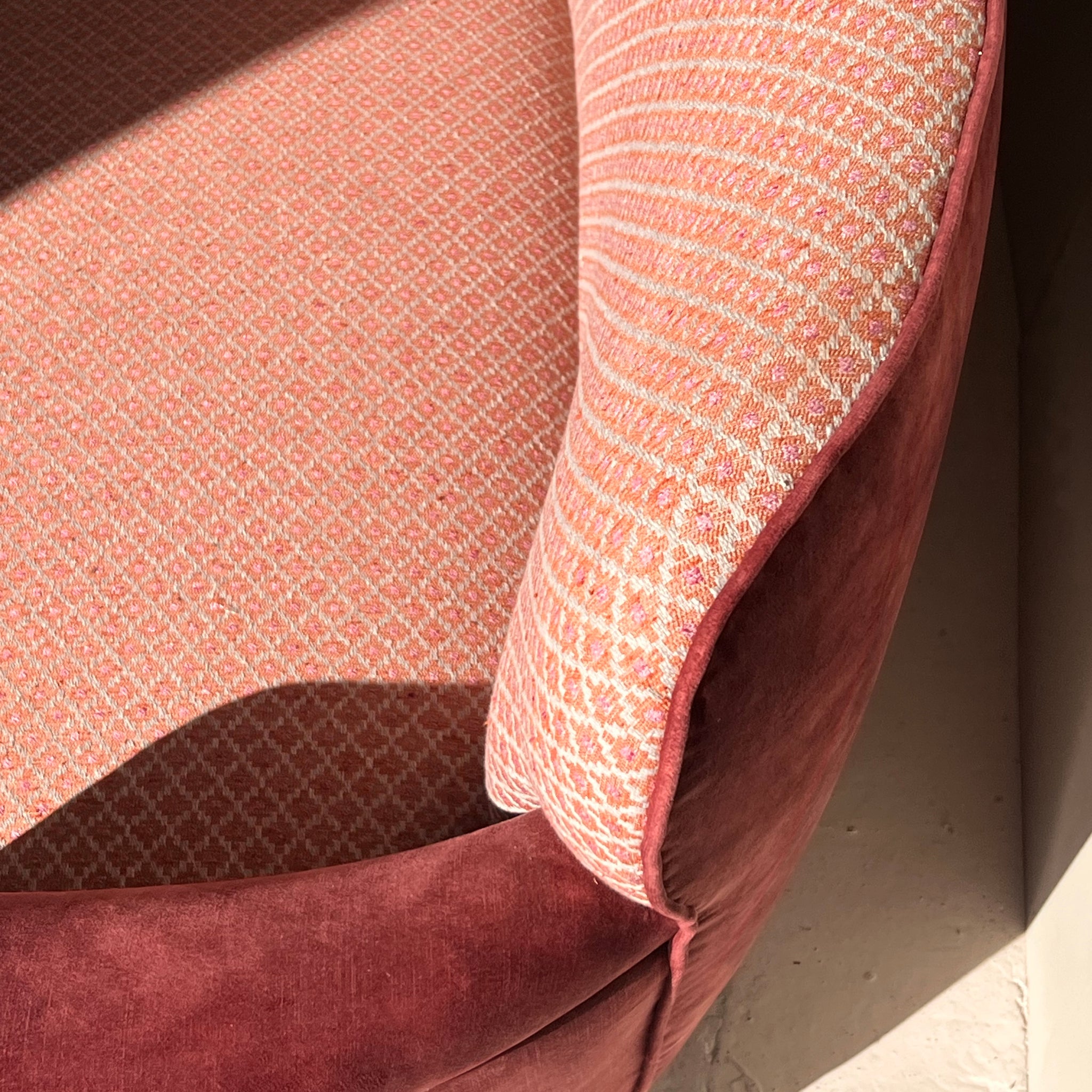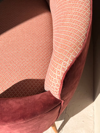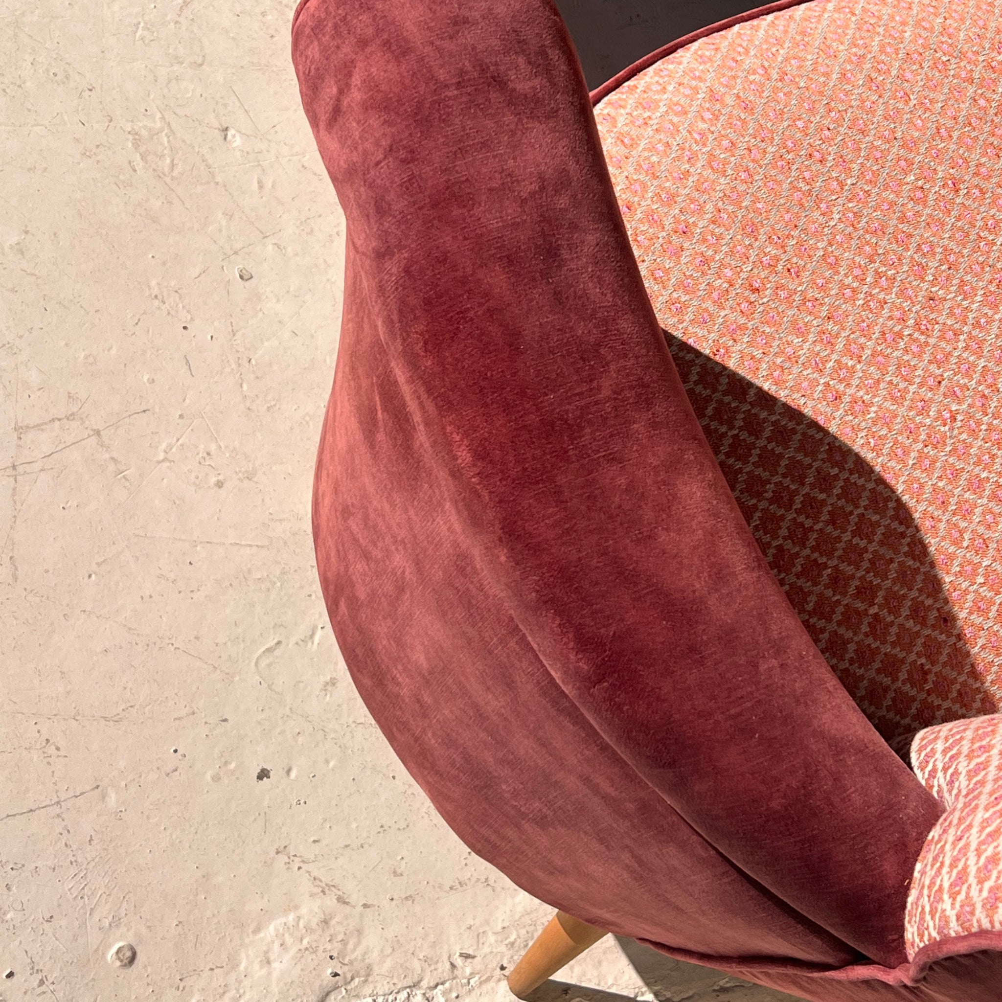 El tapizado, de Gancedo, combina un tejido geométrico en tonos rosados con terciopelo burdeos, creando un contraste delicado y sofisticado. Las patas cónicas de madera clara, ligeramente inclinadas, completan su aire mid-century y aportan ligereza visual.