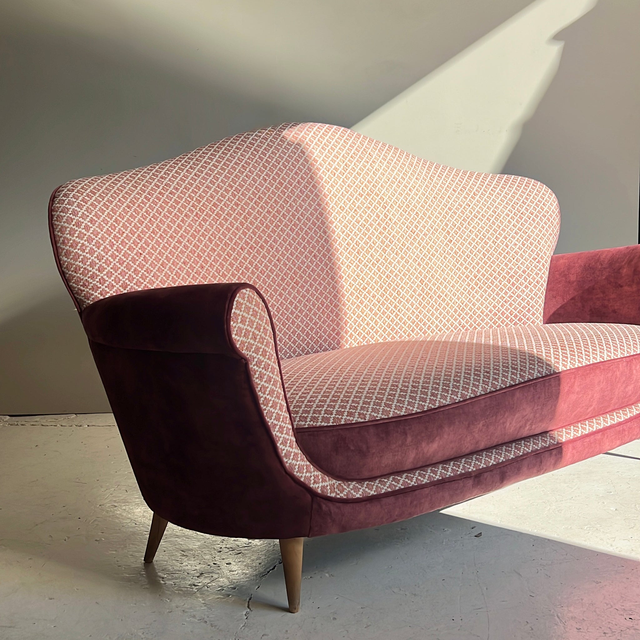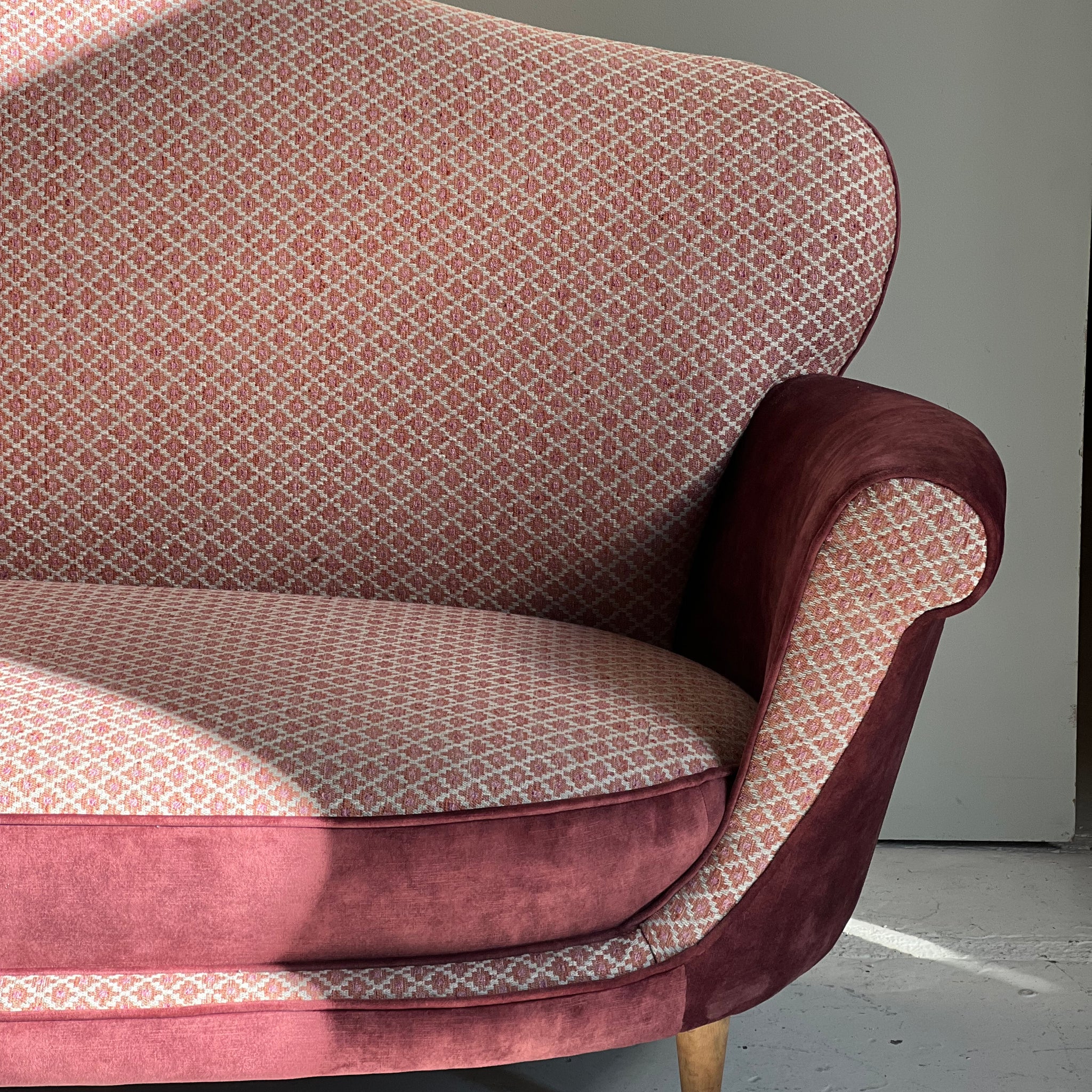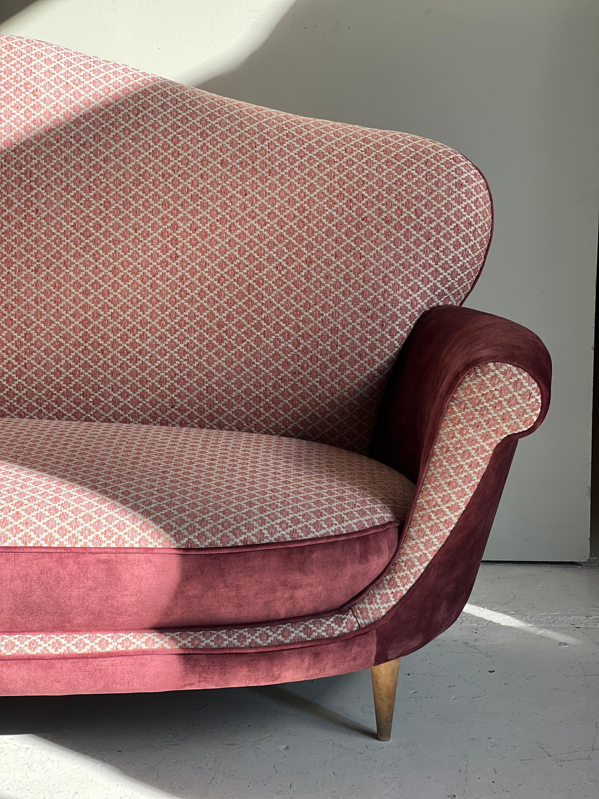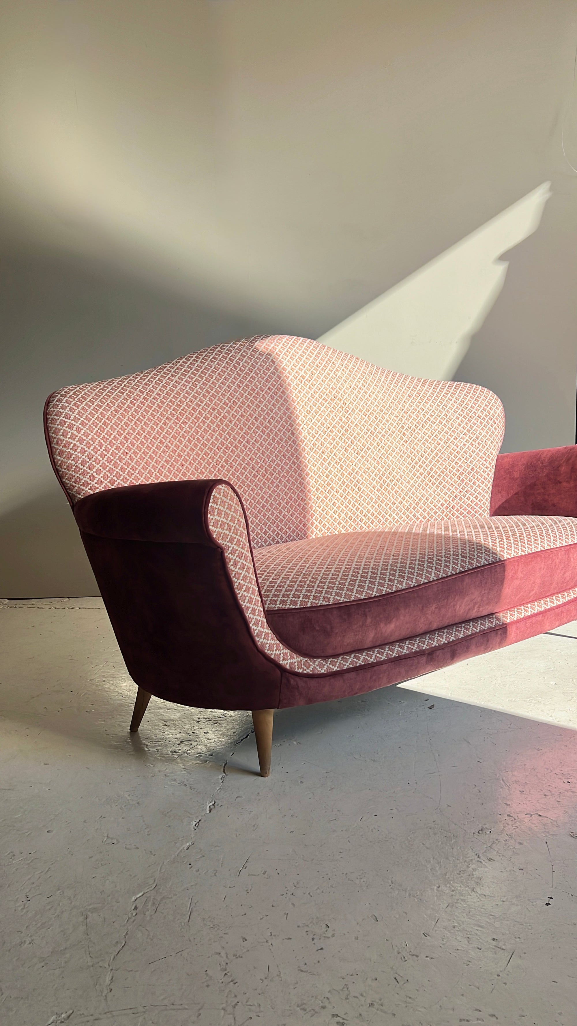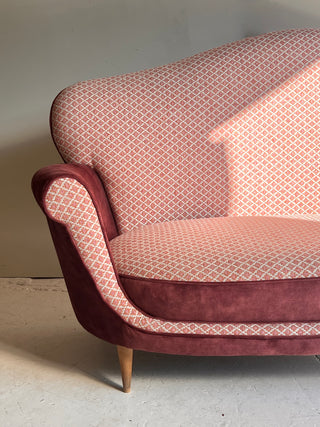 El tapizado, de Gancedo, combina un tejido geométrico en tonos rosados con terciopelo burdeos, creando un contraste delicado y sofisticado. Las patas cónicas de madera clara, ligeramente inclinadas, completan su aire mid-century y aportan ligereza visual.