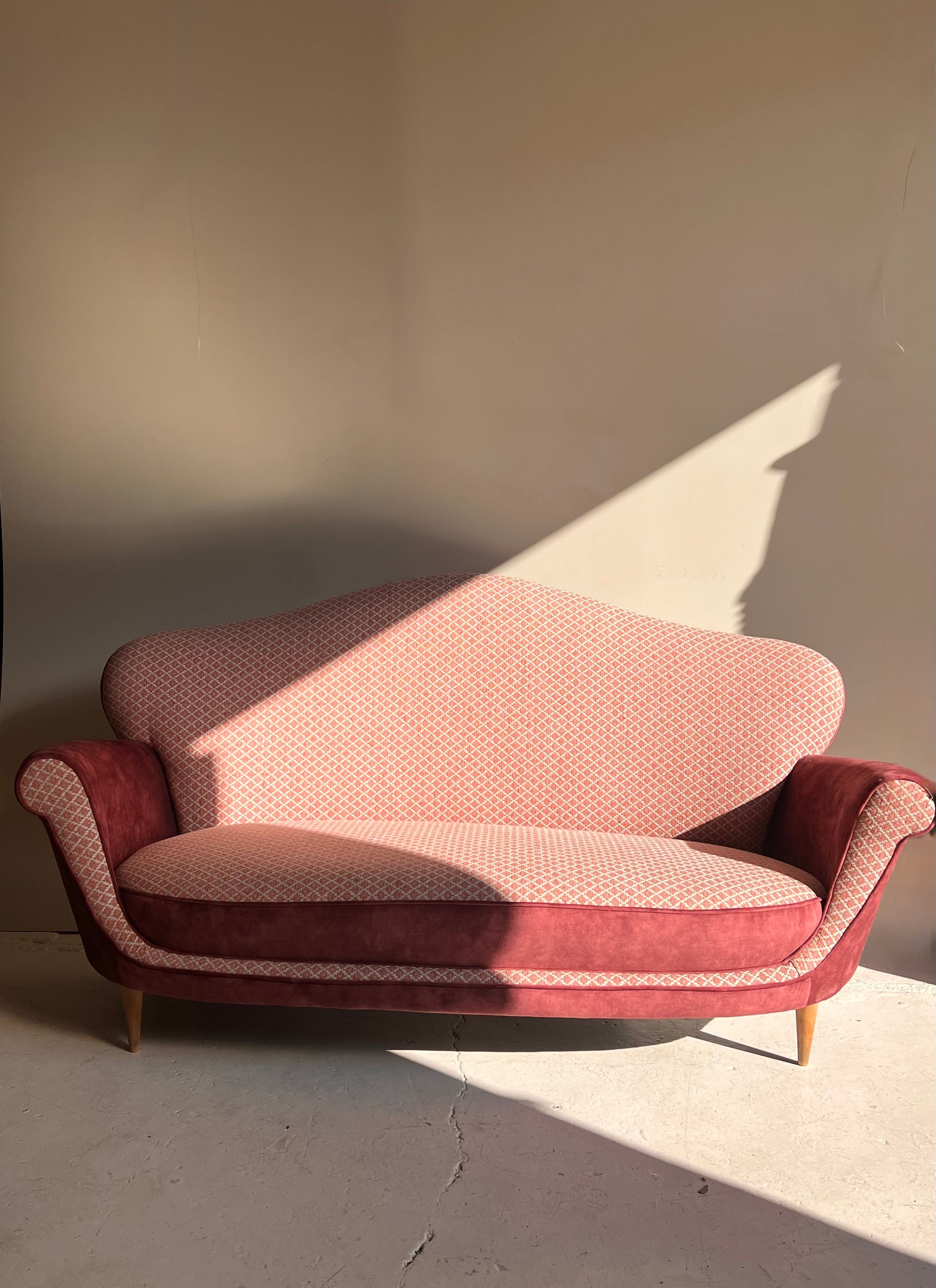 Elegancia y carácter se funden en este sofá de inspiración italiana de los años 50, una pieza que celebra la armonía entre forma y confort. Su silueta orgánica, con respaldo curvado y brazos envolventes, evoca el optimismo y la creatividad del diseño modernista de posguerra.
